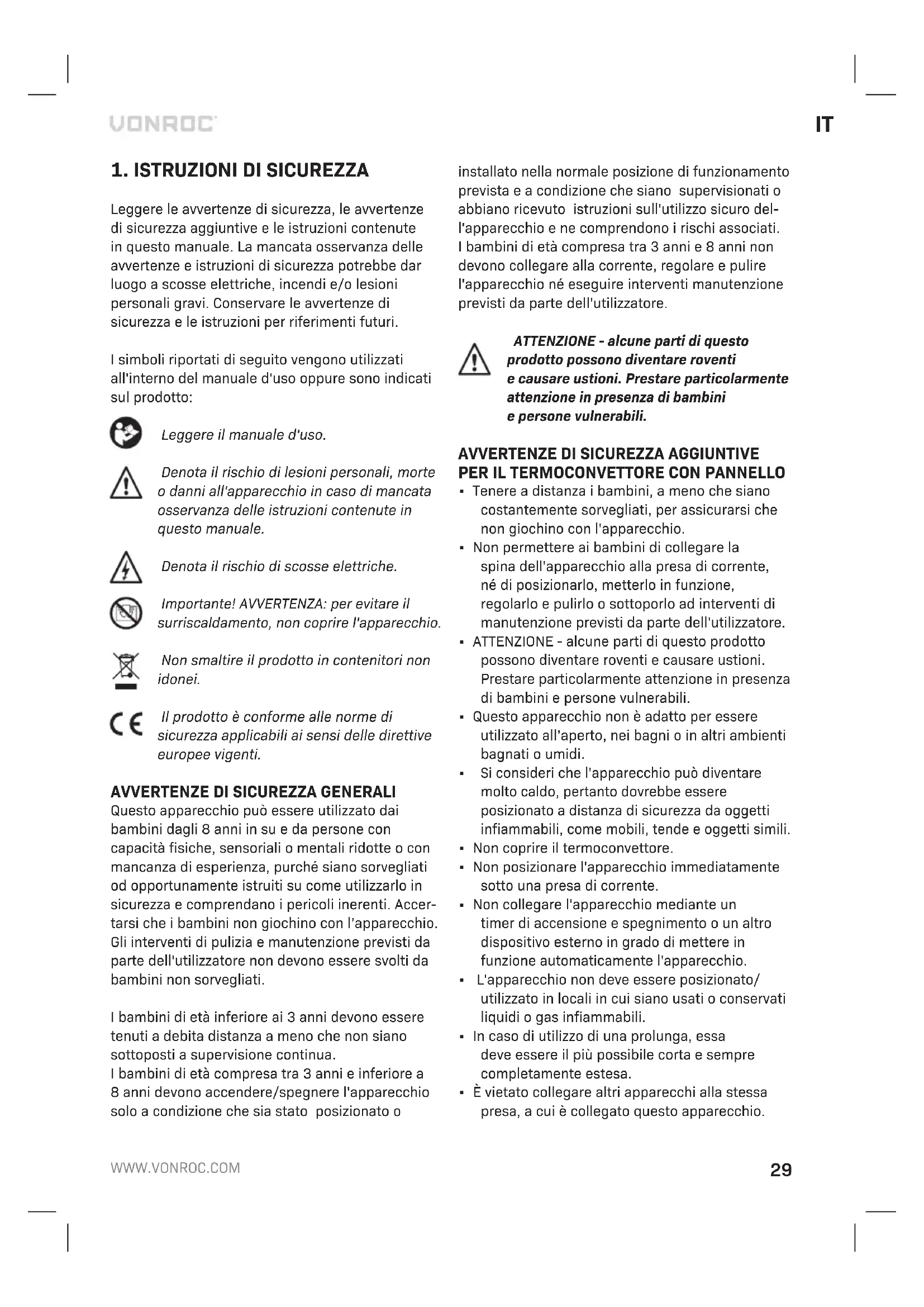 - Riporre il termoconvettore in un ambiente asciutto eben arieggiato. TUTELA AMBIENTALE Le apparecchiature elettriche oelettroniche difettose e/oscartate devono essere raccolte presso gli opportuni siti di riciclaggio. Solo per iPaesi UE Non smaltire gli elettroutensili insieme ai rifiuti do- mestici. Secondo la Direttiva europea 2012/19/EU sui rifiuti delle apparecchiature elettriche ed elet- troniche erelativa implementazione nelle normative locali, gli elettroutensili ormai inutilizzabili devono essere raccolti separatamente esmaltiti in modo ecologico. GARANZIA Iprodotti VONROC sono sviluppati secondo gli stan- dard di qualità più elevati esono garantiti esenti da difetti sia per quanto riguarda imateriali che la lavorazione per il periodo stabilito per legge ade- correre dalla data di acquisto iniziale. Se durante questo periodo il prodotto dovesse presentare dei difetti di materiali e/odi lavorazione, contattare direttamente VONROC. Le seguenti circostanze sono escluse dalla garan- zia: