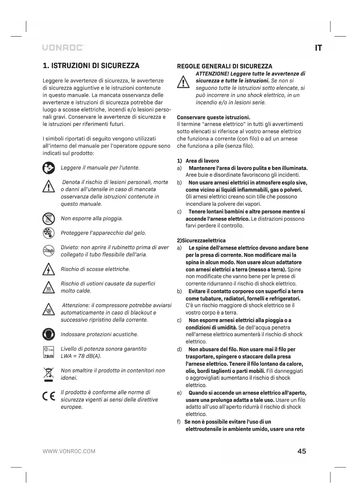 - se è disponibile l’alimentazione di rete (spina collegata correttamente, fusibili magnetotermi- ci integri). Il compressore non si spegne Se il compressore non si spegne quando è stata raggiunta la pressione massima, la valvola di sicu- rezza del serbatoio si attiva. Rivolgersi al Servizio di assistenza autorizzato più vicino per farlo riparare. TUTELA AMBIENTALE Le apparecchiature elettriche o elettroniche difettose e/o scartate devono essere raccolte presso gli opportuni siti di riciclaggio. Solo per i Paesi dell’UE Non smaltire gli elettroutensili insieme ai rifiuti domestici. Secondo la Direttiva europea 2012/19/ EU sui rifiuti delle apparecchiature elettriche ed elettroniche e relativa implementazione nelle nor- mative locali, gli elettroutensili ormai inutilizzabili devono essere raccolti separatamente e smaltiti in modo ecologico. GARANZIA I prodotti VONROC sono sviluppati secondo gli stan- dard di qualità più elevati e sono garantiti esenti da difetti sia per quanto riguarda i materiali che la lavorazione per il periodo stabilito per legge a decorrere dalla data di acquisto iniziale. Se durante questo periodo il prodotto dovesse presentare dei difetti di materiali e/o di lavorazione, contattare direttamente VONROC. Le seguenti circostanze sono escluse dalla garanzia: