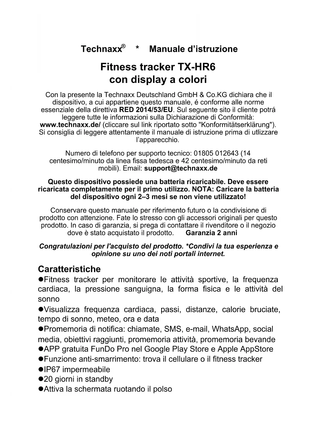- Manuale d’istruzione Fitness tracker TX-HR6 con display a colori Con la presente la Technaxx Deutschland GmbH & Co.KG dichiara che il dispositivo, a cui appartiene questo manuale, é conforme alle norme essenziale della direttiva RED 2014/53/EU. Sul seguente sito il cliente potrá leggere tutte le informazioni sulla Dichiarazione di Conformità: www.technaxx.de/ (cliccare sul link riportato sotto "Konformitätserklärung"). Si consiglia di leggere attentamente il manuale di istruzione prima di utlizzare l’apparecchio. Numero di telefono per supporto tecnico: 01805 012643 (14 centesimo/minuto da linea fissa tedesca e 42 centesimo/minuto da reti mobili). Email: support@technaxx.de Questo dispositivo possiede una batteria ricaricabile. Deve essere ricaricata completamente per il primo utilizzo. NOTA: Caricare la batteria del dispositivo ogni 2–3 mesi se non viene utilizzato! Conservare questo manuale per riferimento futuro o la condivisione di prodotto con attenzione. Fate lo stresso con gli accessori originali per questo prodotto. In caso di garanzia, si prega di contattare il rivenditore o il negozio dove è stato acquistato il prodotto. Garanzia 2 anni Congratulazioni per l'acquisto del prodotto. *Condivi la tua esperienza e opinione su uno dei noti portali internet. Caratteristiche Fitness tracker per monitorare le attività sportive, la frequenza cardiaca, la pressione sanguigna, la forma fisica e le attività del sonno Visualizza frequenza cardiaca, passi, distanze, calorie bruciate, tempo di sonno, meteo, ora e data Promemoria di notifica: chiamate, SMS, e-mail, WhatsApp, social media, obiettivi raggiunti, promemoria attività, promemoria bevande APP gratuita FunDo Pro nel Google Play Store e Apple AppStore Funzione anti-smarrimento: trova il cellulare o il fitness tracker IP67 impermeabile 20 giorni in standby Attiva la schermata ruotando il polsoSpecifiche tecniche Schermo Schermo a colori da 0,96" (80*160 pixel) Processore BK3431Q Sensore della frequenza cardiaca HRS3300 Classe di protezione IP67 Bluetooth / Distanza Versione Bluetooth 4.0 / ~10m Frequenza di trasmissione BT 2,4GHz Potenza in uscita diffusa BT max. 2,5mW Alimentazione Batteria ricaricabile incorporata da 90mAh ai polimeri di litio da 3,7V Tempo di operatività ~7 giorni di utilizzo / ~20 giorni in standby Tempo di ricarica ~1 ora APP FunDo Pro Lingue supportate dall'APP GB, DE, FR, ES, PT, IT, PL, NL, RU, CZ, TR (Novembre 2018) Peso / Dimensioni 21,5 g / (L) 54 x (P) 18,9 x (A) 12 mm Temperatura di conservazione / Temperatura di funzionamento da –10°C fino a 45°C Contenuto della confezione Technaxx
