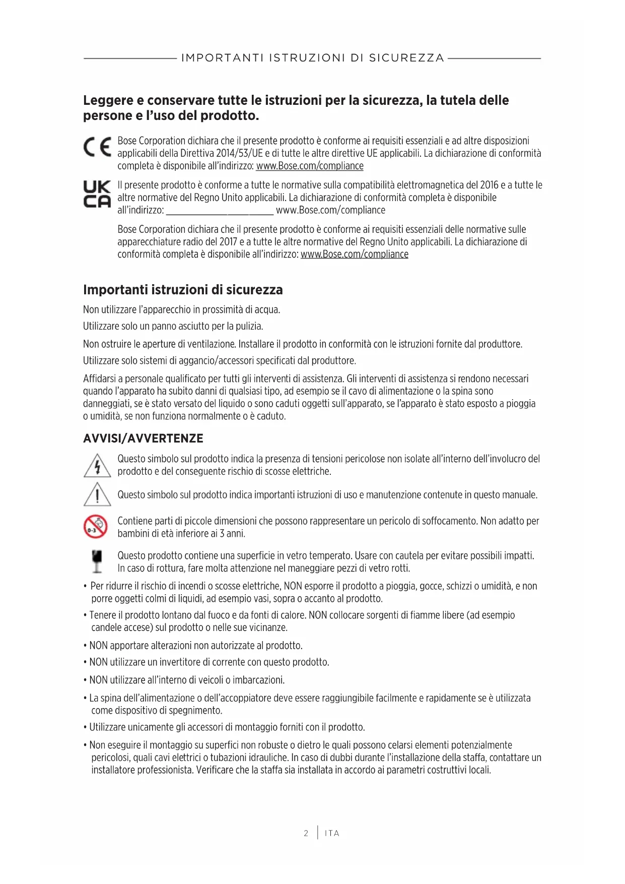 Leggere e conservare tutte le istruzioni per la sicurezza, la tutela delle persone e l’uso del prodotto. Bose Corporation dichiara che il presente prodotto è conforme ai requisiti essenziali e ad altre disposizioni applicabili della Direttiva 2014/53/UE e di tutte le altre direttive UE applicabili. La dichiarazione di conformità completa è disponibile all’indirizzo: www.Bose.com/compliancewww.Bose.com/compliance Il presente prodotto è conforme a tutte le normative sulla compatibilità elettromagnetica del 2016 e a tutte le altre normative del Regno Unito applicabili. La dichiarazione di conformità completa è disponibile all’indirizzo: www.Bose.com/compliancewww.Bose.com/compliance Bose Corporation dichiara che il presente prodotto è conforme ai requisiti essenziali delle normative sulle apparecchiature radio del 2017 e a tutte le altre normative del Regno Unito applicabili. La dichiarazione di conformità completa è disponibile all’indirizzo: www.Bose.com/compliancewww.Bose.com/compliance Importanti istruzioni di sicurezza Non utilizzare l’apparecchio in prossimità di acqua. Utilizzare solo un panno asciutto per la pulizia. Non ostruire le aperture di ventilazione. Installare il prodotto in conformità con le istruzioni fornite dal produttore. Utilizzare solo sistemi di aggancio/accessori specificati dal produttore. Affidarsi a personale qualificato per tutti gli interventi di assistenza. Gli interventi di assistenza si rendono necessari quando l’apparato ha subito danni di qualsiasi tipo, ad esempio se il cavo di alimentazione o la spina sono danneggiati, se è stato versato del liquido o sono caduti oggetti sull’apparato, se l’apparato è stato esposto a pioggia o umidità, se non funziona normalmente o è caduto. AVVISI/AVVERTENZE Questo simbolo sul prodotto indica la presenza di tensioni pericolose non isolate all’interno dell’involucro del prodotto e del conseguente rischio di scosse elettriche. Questo simbolo sul prodotto indica importanti istruzioni di uso e manutenzione contenute in questo manuale. Contiene parti di piccole dimensioni che possono rappresentare un pericolo di soffocamento. Nonadatto per bambini di età inferiore ai 3 anni. Questo prodotto contiene una superficie in vetro temperato. Usare con cautela per evitare possibili impatti. Incaso di rottura, fare molta attenzione nel maneggiare pezzi di vetro rotti.