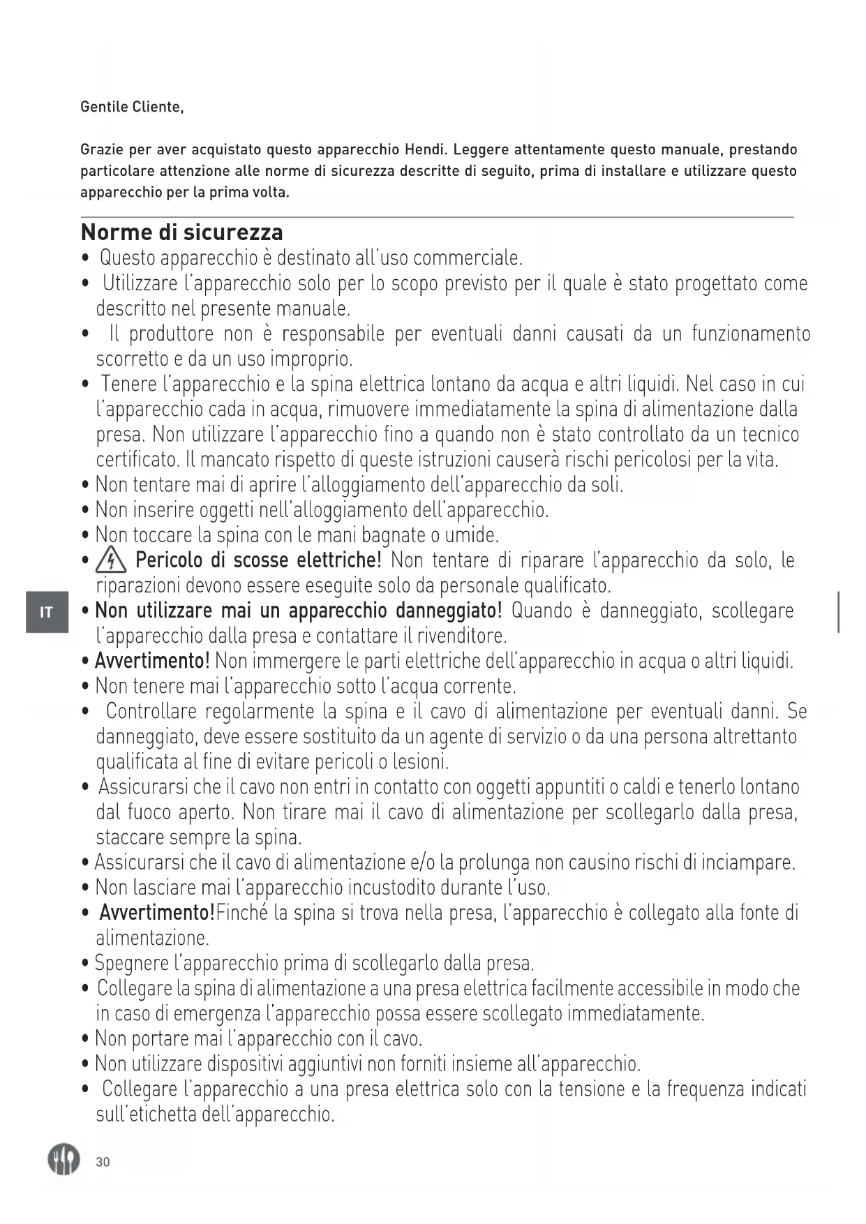 Gentile Cliente, Grazie per aver acquistato questo apparecchio Hendi. Leggere attentamente questo manuale, prestando particolare attenzione alle norme di sicurezza descritte di seguito, prima di installare e utilizzare questo apparecchio per la prima volta. Norme di sicurezza
