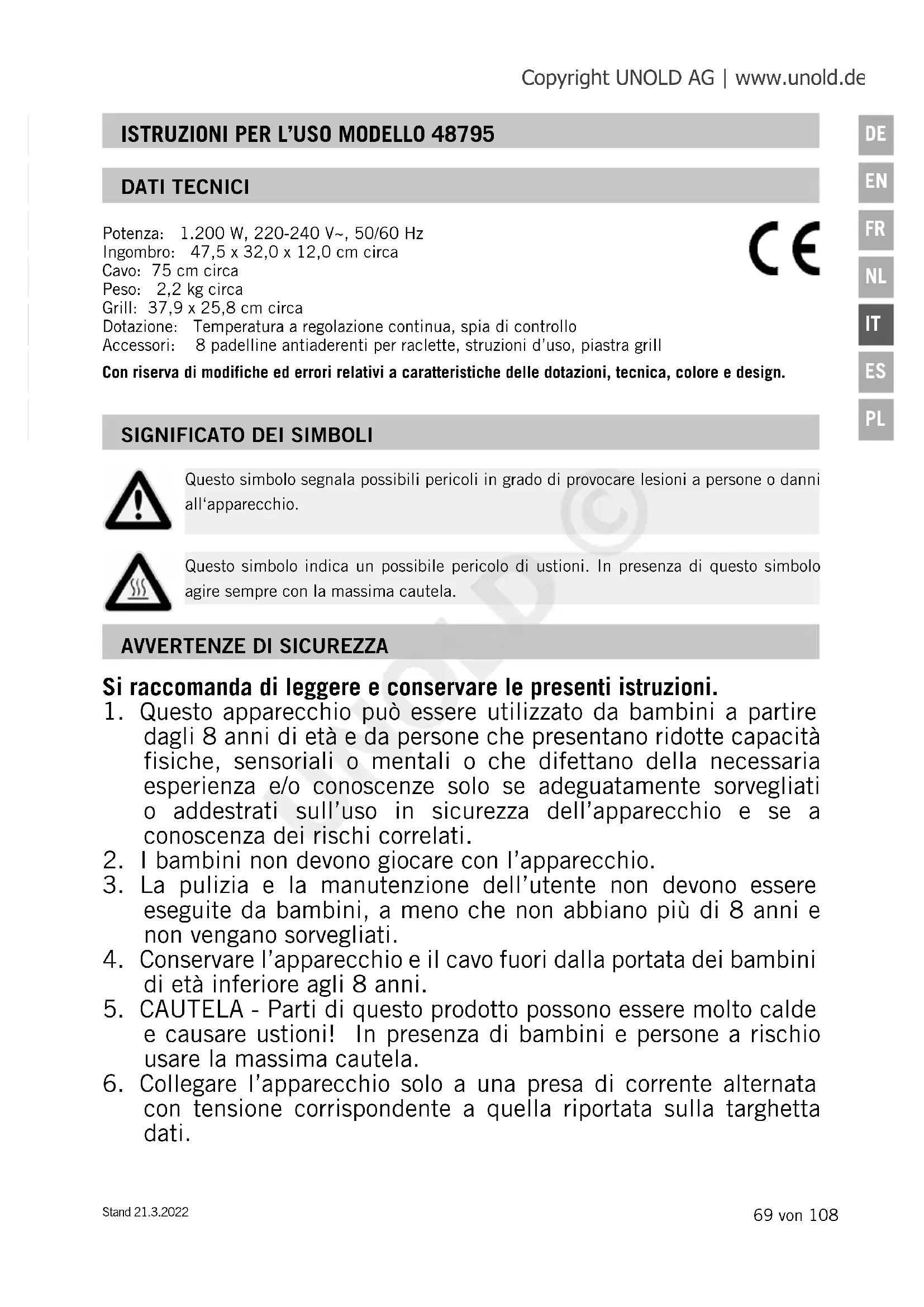 Questo simbolo segnala possibili pericoli in grado di provocare lesioni a persone o danni all‘apparecchio. Questo simbolo indica un possibile pericolo di ustioni. In presenza di questo simbolo agire sempre con la massima cautela. Copyright UNOLD AG | www.unold.de UNOLD ©70 von 108 Stand 21.3.2022