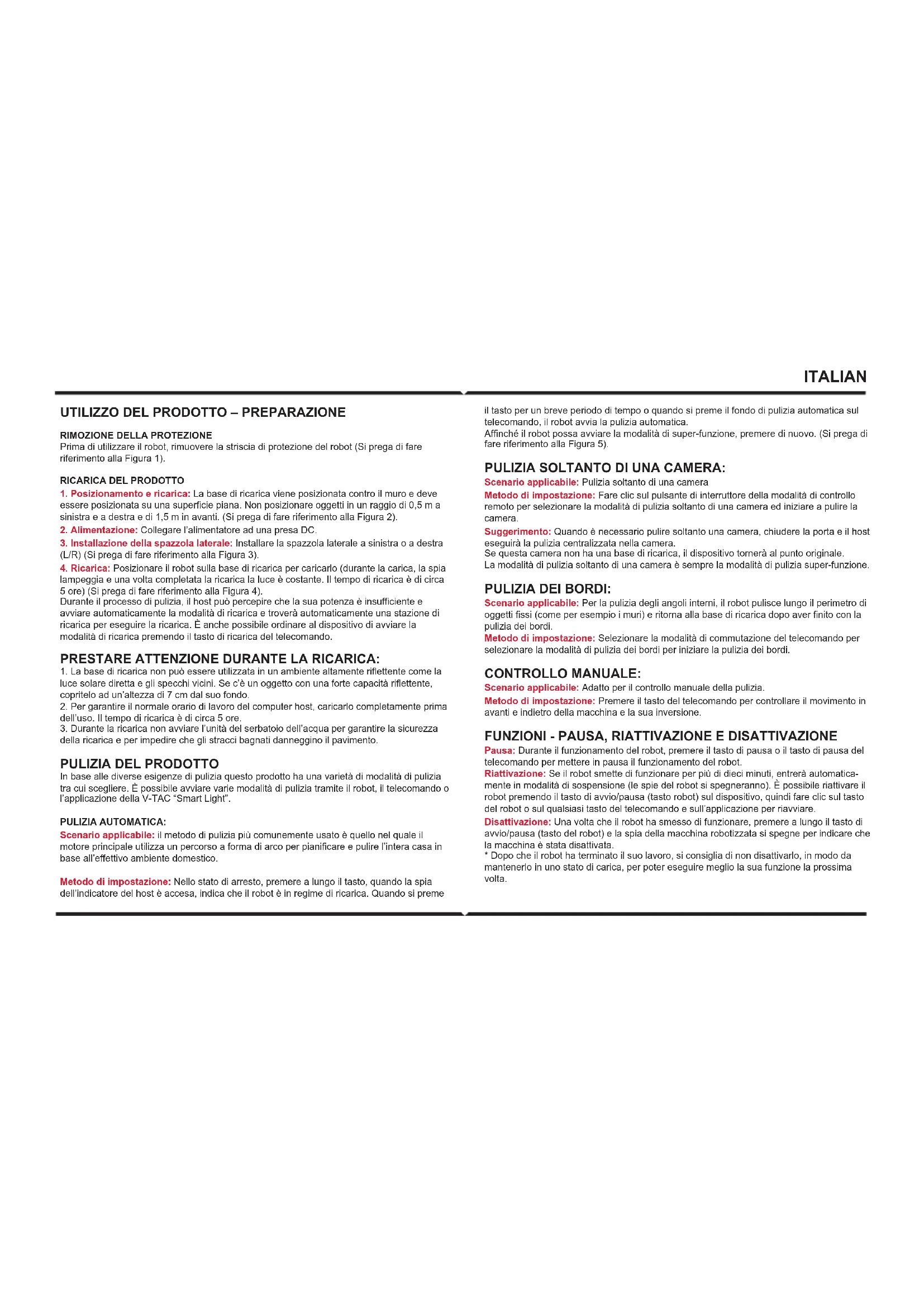 In base alle diverse esigenze di pulizia questo prodotto ha una varietà di modalità di pulizia tra cui scegliere. È possibile avviare varie modalità di pulizia tramite il robot, il telecomando o l’applicazione della V-TAC “Smart Light”. PULIZIA AUTOMATICA: Scenario applicabile: il metodo di pulizia più comunemente usato è quello nel quale il motore principale utilizza un percorso a forma di arco per pianificare e pulire l’intera casa in base all’effettivo ambiente domestico. Metodo di impostazione: Nello stato di arresto, premere a lungo il tasto, quando la spia dell’indicatore del host è accesa, indica che il robot è in regime di ricarica. Quando si preme