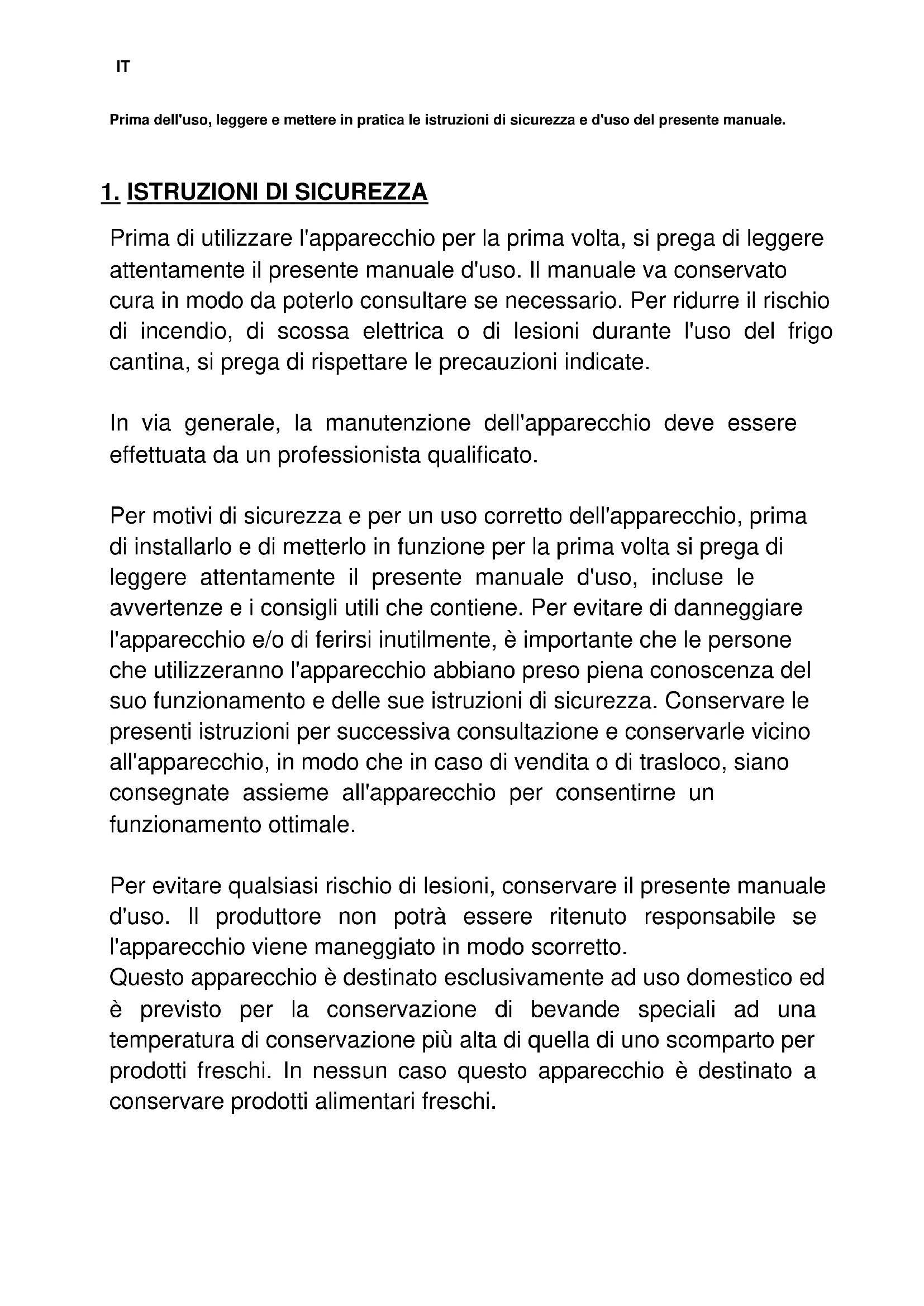 Prima di utilizzare l'apparecchio per la prima volta, si prega di leggere attentamente il presente manuale d'uso. Il manuale va conservato cura in modo da poterlo consultare se necessario. Per ridurre il rischio di incendio, di scossa elettrica o di lesioni durante l'uso del frigo cantina, si prega di rispettare le precauzioni indicate. In via generale, la manutenzione dell'apparecchio deve essere effettuata da un professionista qualificato. Per motivi di sicurezza e per un uso corretto dell'apparecchio, prima di installarlo e di metterlo in funzione per la prima volta si prega di leggere attentamente il presente manuale d'uso, incluse le avvertenze e i consigli utili che contiene. Per evitare di danneggiare l'apparecchio e/o di ferirsi inutilmente, è importante che le persone che utilizzeranno l'apparecchio abbiano preso piena conoscenza del suo funzionamento e delle sue istruzioni di sicurezza. Conservare le presenti istruzioni per successiva consultazione e conservarle vicino all'apparecchio, in modo che in caso di vendita o di trasloco, siano consegnate assieme all'apparecchio per consentirne un funzionamento ottimale. Per evitare qualsiasi rischio di lesioni, conservare il presente manuale d'uso. Il produttore non potrà essere ritenuto responsabile se l'apparecchio viene maneggiato in modo scorretto. Questo apparecchio è destinato esclusivamente ad uso domestico ed è previsto per la conservazione di bevande speciali ad una temperatura di conservazione più alta di quella di uno scomparto per prodotti freschi. In nessun caso questo apparecchio è destinato a conservare prodotti alimentari freschi.IT Verificare che la tensione dell'impianto elettrico della casa corrisponda a quella indicata sulla targa informativa: l'apparecchio deve essere collegato ad una presa di terra regolamentare. Riparazioni o collegamenti scorretti possono rappresentare un rischio per la sicurezza. Se si ha il minimo dubbio, far controllare il proprio impianto elettrico da un professionista. Per la tua protezione, questo apparecchio deve essere collegato correttamente ad una presa di terra. Non tagliare né togliere il filo di terra dal cavo di alimentazione fornito. Per motivi di sicurezza, non usare prolunghe. Se l'apparecchio si fosse rovinato (ad esempio per un forte urto) o danneggiato (sovratensione dovuta a fulmine, allagamento, incendio), può essere pericoloso utilizzarlo. Scollegare l'apparecchio dalla presa elettrica e farlo controllare da un riparatore professionista autorizzato. Per evitare pericoli, non sostituire da soli il cavo di alimentazione se rovinato. Contattare il proprio rivenditore, un centro assistenza autorizzato o un riparatore professionista. Questo apparecchio deve essere posizionato in modo che la presa a muro sia raggiungibile. Non spostare l'apparecchio una volta che è stato caricato con i vini perché la scocca potrebbe deformarsi, oltre a dover fare delle riparazioni. I componenti elettrici non devono essere a vista.
