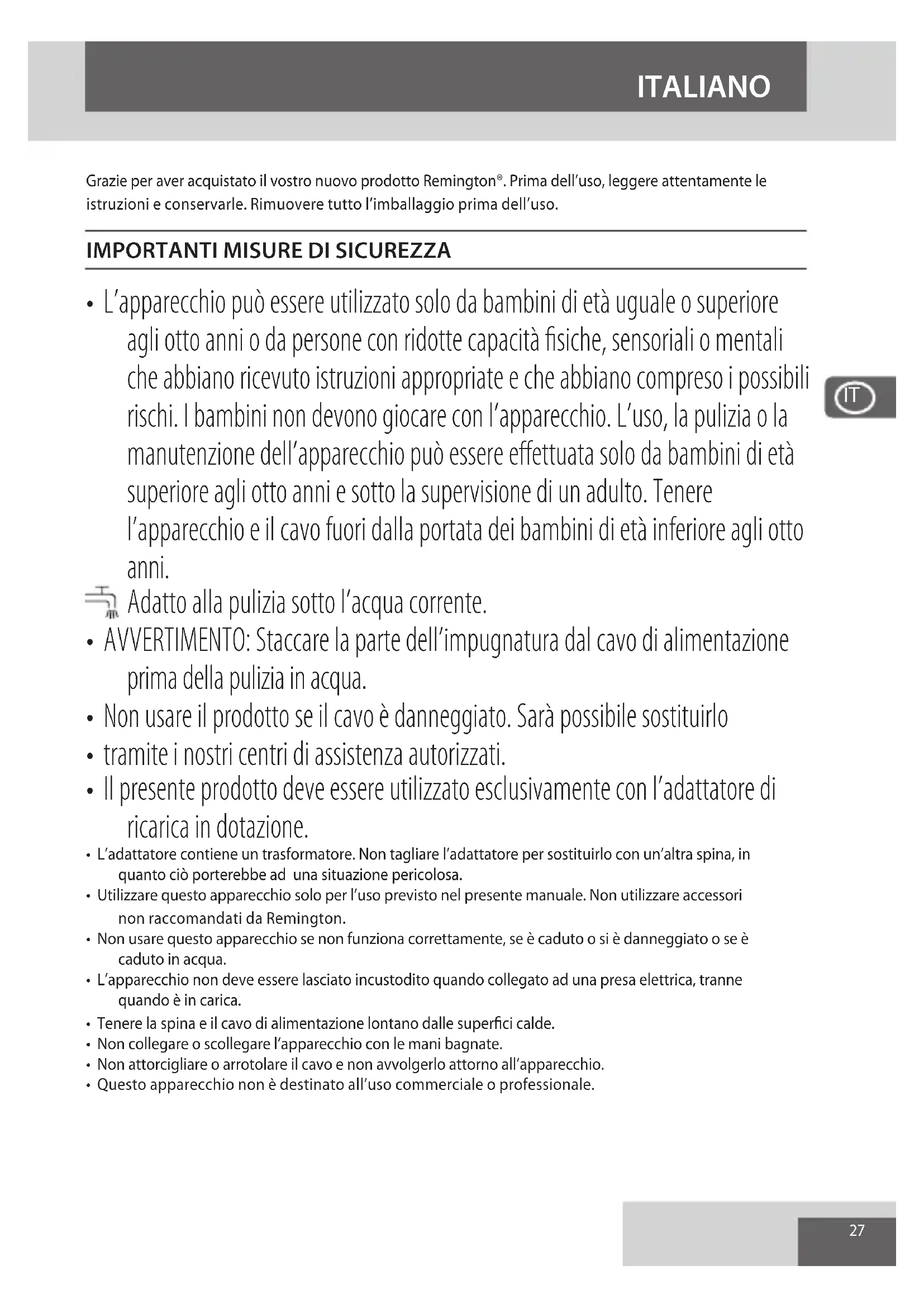 - L’adattatore contiene un trasformatore. Non tagliare l’adattatore per sostituirlo con un’altra spina, in quanto ciò porterebbe ad una situazione pericolosa.• Utilizzare questo apparecchio solo per l’uso previsto nel presente manuale. Non utilizzare accessori non raccomandati da Remington.• Non usare questo apparecchio se non funziona correttamente, se è caduto o si è danneggiato o se è caduto in acqua.• L’apparecchio non deve essere lasciato incustodito quando collegato ad una presa elettrica, tranne quando è in carica.• Tenere la spina e il cavo di alimentazione lontano dalle superci calde.• Non collegare o scollegare l’apparecchio con le mani bagnate.• Non attorcigliare o arrotolare il cavo e non avvolgerlo attorno all’apparecchio.• Questo apparecchio non è destinato all’uso commerciale o professionale.
