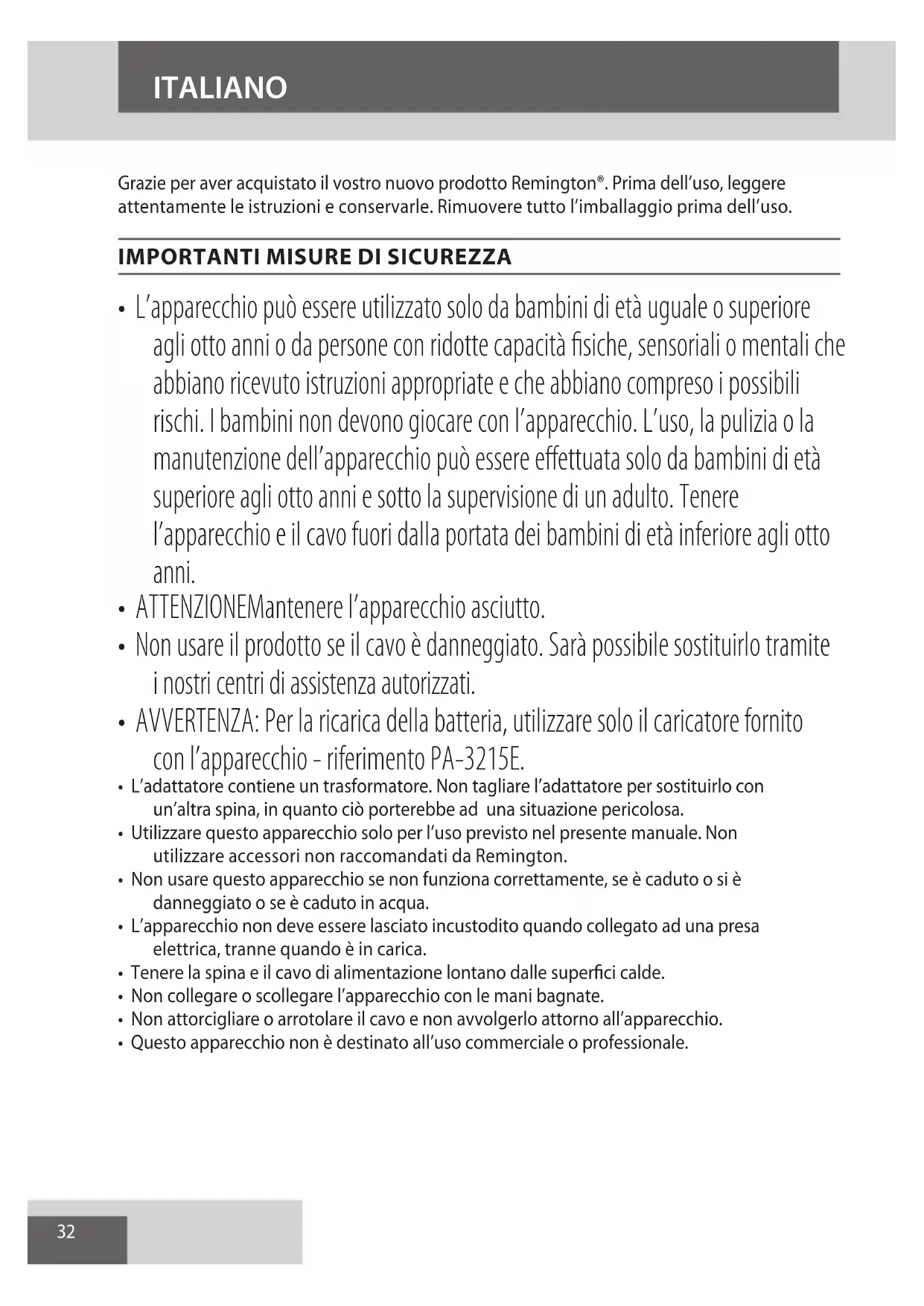 AE32 Grazie per aver acquistato il vostro nuovo prodotto Remington®. Prima dell’uso, leggere attentamente le istruzioni e conservarle. Rimuovere tutto l’imballaggio prima dell’uso.