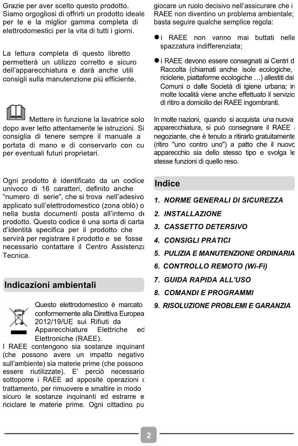 Grazie per aver scelto questo prodotto. Siamo orgogliosi di offrirti un prodotto ideale per te e la miglior gamma completa di elettrodomestici per la vita di tutti i giorni. La lettura completa di questo libretto permetterà un utilizzo corretto e sicuro dell’apparecchiatura e darà anche utili consigli sulla manutenzione più efficiente. Mettere in funzione la lavatrice solo dopo aver letto attentamente le istruzioni. Si consiglia di tenere sempre il manuale a portata di mano e di conservarlo con cura per eventuali futuri proprietari. Ogni prodotto è identificato da un codice univoco di 16 caratteri, definito anche “numero di serie”, che si trova nell’adesivo applicato sull’elettrodomestico (zona oblò) o nella busta documenti posta all’interno del prodotto. Questo codice è una sorta di carta d’identità specifica per il prodotto che servirà per registrare il prodotto e se fosse necessario contattare il Centro Assistenza Tecnica.