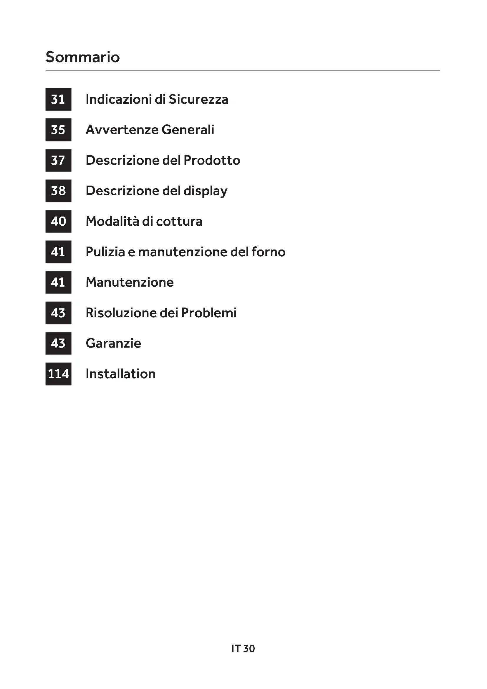 Ove possibile, evitare di pre-riscaldare il forno e cercare sempre di riempirlo. Aprire la porta del forno quanto necessario, perché vi sono disper- sioni di calore ogni volta che viene aperta. Per ris- parmiare molta energia sarà suciente spegnere il forno dai 5 ai 10 minuti prima della fine del tem- po di cottura pianificato, e servirsi del calore che il forno continua a generare. Tenere le guarnizioni pulite e in ordine, per evitare eventuali dispersioni di energia. Se si dispone di un contratto di ener- gia elettrica a taria oraria, il programma “cottura ritardata” renderà più semplice il risparmio spo- stando l’avvio del programma negli orari a taria ridotta.DE 44 Sicherheitshinweise Allgemeine Anweisungen Produktbeschreibung Betrieb des Backofens Kochmodi Reinigung und Wartung des Backofens Allgemeine Reinigungshinweise Häug gestellte fragen Installation Zusammenfassung