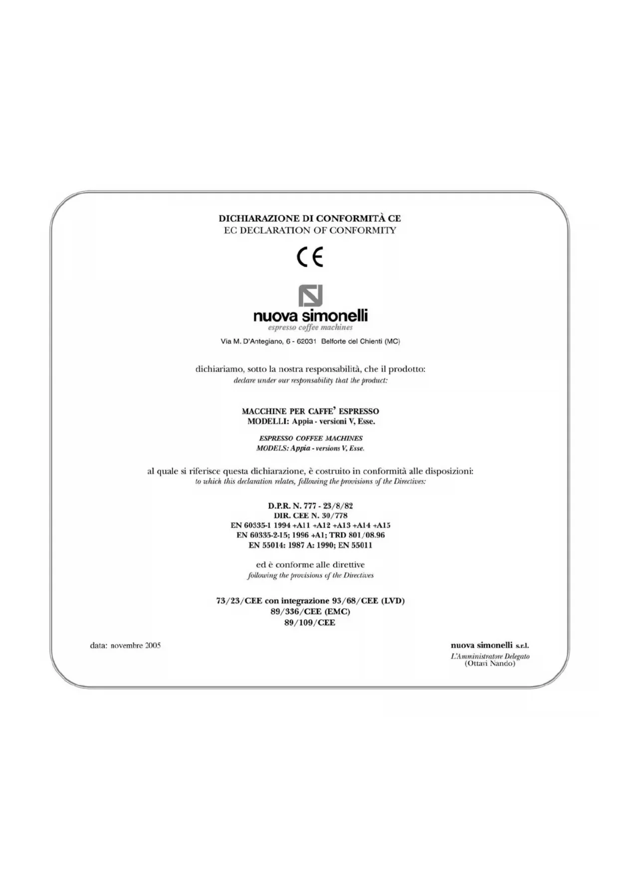 Rel. 01 - 2006 Complimenti, con l’acquisto del modello Lei ha fatto un’ottima scelta. L’acquisto di una macchina per caffè espresso professionale coinvolge diversi fattori di selezione: il nome dell’azienda produttrice, le specifiche fun- zioni della macchina, l’affidabilità tecnica, la possibilità di una pronta e adeguata assistenza, il costo. Lei certamente ha valutato tutto questo e poi ha deciso: scelgo il modello . Per noi, ha scelto il meglio e potrà verificarlo, caffè dopo caffè, cappuccino dopo cappuccino. Vedrà quanto sarà comodo, pratico ed efficiente lavorare con . Se è la prima volta che acquista una macchina Nuova Simonelli, benvenuto nell’alta caffetteria; se è già nostro Cliente, siamo molto lusingati della Sua fedeltà. Grazie della preferenza. Cordialmente, Nuova Simonelli s.r.l. 3_Appia2_3GR_I.qxp 21-04-2006 11:34 Pagina 1ITALIANO