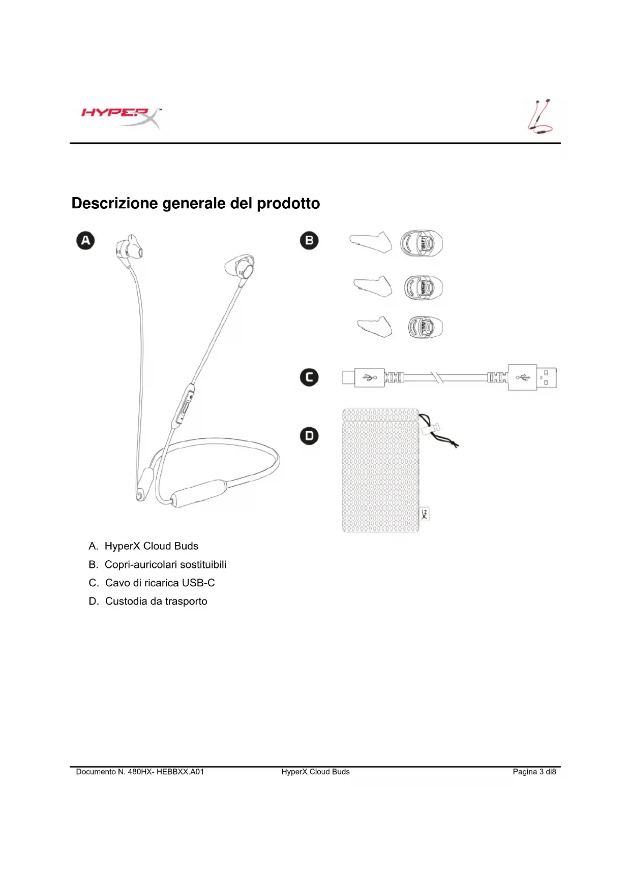 Descrizione generale del prodotto A. HyperX Cloud Buds B. Copri-auricolari sostituibili C. Cavo di ricarica USB-C D. Custodia da trasportoDocumento N. 480HX- HEBBXX.A01 HyperX Cloud Buds Pagina 4 di8