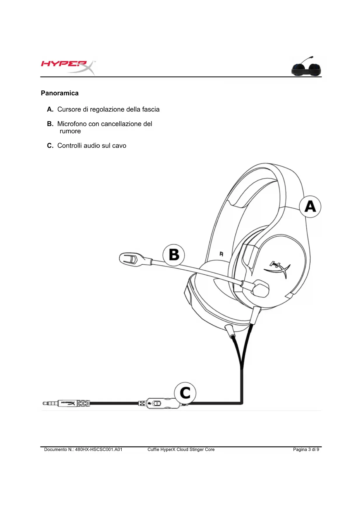 A. Cursore di regolazione della fascia B. Microfono con cancellazione del rumore C. Controlli audio sul cavoDocumento N.: 480HX-HSCSC001.A01 Cuffie HyperX Cloud Stinger Core Pagina 4 di 9
