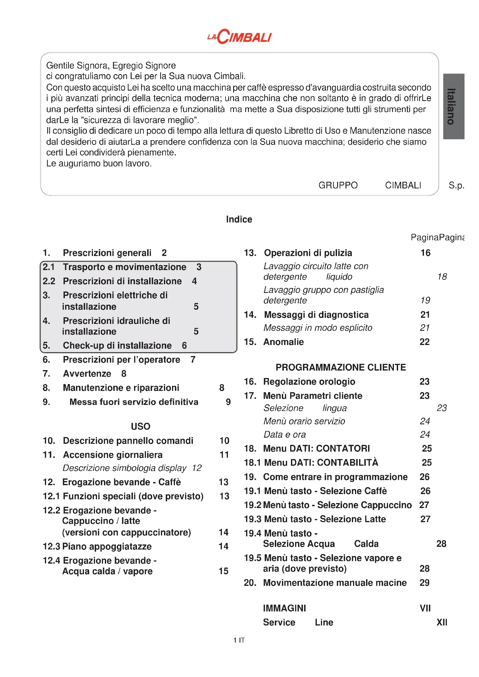 01_S39 TE.indd 6 07/11/2017 16:52:18Italiano 1 IT Indice PaginaPagina Gentile Signora, Egregio Signore ci congratuliamo con Lei per la Sua nuova Cimbali. Con questo acquisto Lei ha scelto una macchina per caffè espresso d'avanguardia costruita secondo i più avanzati principi della tecnica moderna; una macchina che non soltanto è in grado di offrirLe XQDSHUIHWWDVLQWHVLGLHI¿FLHQ]DHIXQ]LRQDOLWjPDPHWWHD6XDGLVSRVL]LRQHWXWWLJOLVWUXPHQWLSHU darLe la "sicurezza di lavorare meglio". Il consiglio di dedicare un poco di tempo alla lettura di questo Libretto di Uso e Manutenzione nasce
