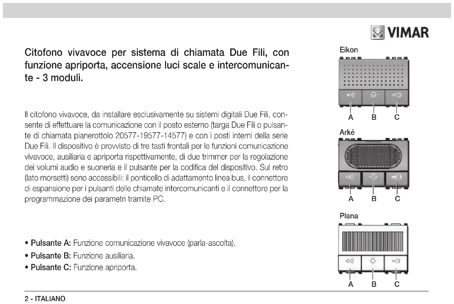 - Pulsante C: Funzione apriporta. Citofono vivavoce per sistema di chiamata Due Fili, con funzione apriporta, accensione luci scale e intercomunican- te - 3moduli. Arké