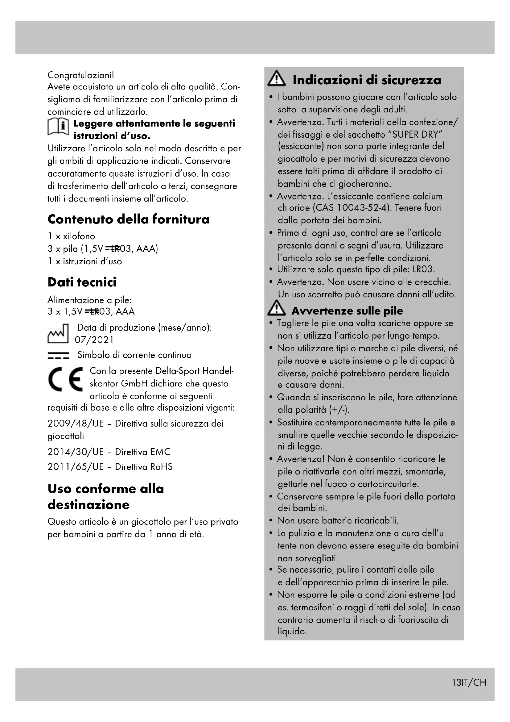 - Il numero delle melodie dipende dall’interruttore (1i): – Interruttore su CRAZY SOUND: melodie “crazy sound” e “xilofono” – Interruttore su PIANO: melodie “piano” e “xilofono” – I tasti si illuminano se vengono premuti durante la riproduzione delle melodie. Assegnazione delle note ai tasti È possibile utilizzare l’interruttore (1j) per assegnare ai tasti (1i) note al pianoforte o crazy sound. Per farlo, spostare l’interruttore (1i) sul simbolo del piano o dei crazy sound. Conservazione, pulizia In caso di mancato utilizzo, riporre l’articolo a temperatura ambiente senza pile in un luogo asciutto e pulito. Pulire solo con un panno asciutto. IMPORTANTE! Non utilizzare mai detergenti aggressivi. Smaltimento Una volta che l’articolo diventa inutilizzabile, non gettarlo nei rifiuti domestici, ma smaltirlo correttamente nel pieno rispetto dell’ambiente. È possibile ottenere informazioni sui punti di raccolta e sui loro orari di apertura presso l’ufficio amministrativo competente. Le batterie difettose o usate devono essere riciclate in conformità alla direttiva 2006/66/CE e successive modifiche. Restituire le batterie e/o l’articolo attraverso i centri di raccolta offerti. I materiali di imballaggio, ad es. i sacchetti, non devono giungere nelle mani dei bambini. Tenere il materiale di imballaggio fuori dalla portata dei bambini. Danni ambientali dovuti a un errato smaltimento delle batterie! Le batterie non devono essere smaltite come rifiuti domestici. Possono contenere metalli pesanti tossici e sono soggetti a un trattamento speciale dei rifiuti. I simboli chimici dei metalli pesanti sono i seguenti: Cd = cadmio, Hg = mercurio, Pb = piombo. Pertanto, restituire le batterie usate in un punto di raccolta comunale. Smaltire l’articolo e il materiale di imballaggio nel pieno rispetto dell’am- biente. Si noti la marcatura dei materiali di imballaggio durante la separazione dei rifiuti, questi sono contrassegnati da abbreviazioni (a) e numeri (b) con il seguente significato: 1-7: materiali plastici/20-22: carta e cartone/80-98: materiali compositi. L’articolo e i materiali di imballaggio sono rici- clabili, smaltirli separatamente per una migliore gestione dei rifiuti. Il logo Triman è valido solo per la Francia. Per informazioni su come smaltire l’articolo non più utilizzabile, rivolgersi alle autorità locali o comunali.16 Avvertenze sulla garanzia e sulla gestione dei servizi di assistenza L’articolo è stato prodotto con la massima cura e sotto un continuo controllo. DELTA-SPORT HAN- DELSKONTOR GmbH concede ai clienti finali privati, su questo articolo, tre anni di garanzia dalla data di acquisto (termine di garanzia) sul- la base delle seguenti disposizioni. La garanzia vale solo per i vizi di materiale e di lavorazione. La garanzia non si estende alle parti soggette ad un normale degradamento e che siano quindi da considerarsi come pezzi soggetti ad usura (ad es. le batterie) né ai pezzi fragili come ad es. interruttori, batterie ricaricabili oppure pezzi in vetro. Dalla presente garanzia sono escluse le richieste legate a casi di utilizzo non conforme oppure di abuso dell’articolo, oppure di utilizzo avvenuto non nell’ambito delle condizioni previste oppure del campo di impiego previsto, oppure in caso di non osservanza delle direttive riportate nelle istruzioni d’uso, a meno che il cliente non dimostri che sussista un vizio di materiale o di lavorazione che non sia riconducibile ad una delle circostanze riportate sopra. Le richieste di garanzia possono essere avanza- te solo entro il relativo termine, su presentazione dello scontrino originale di acquisto. Si prega quindi di conservare lo scontrino originale. Il termine di garanzia non sarà prolungato a seguito di eventuali riparazioni effettuate sulla base della garanzia, della garanzia obbligato- ria prevista per legge oppure di accondiscen- denza. Ciò vale anche per le parti sostituite oppure riparate. In caso di contestazione rivolgersi dapprima alla hotline di assistenza sotto indicata oppure mettersi in contatto con noi via e-mail. Laddove sussista un caso coperto dalla garanzia, l’artico- lo sarà – a nostra discrezione – da noi riparato gratuitamente, sostituito oppure sarà rimborsato il prezzo di acquisto. Non sussistono ulteriori diritti derivanti dalla garanzia. I vostri diritti giuridici, in particolare i diritti di garanzia obbligatoria prevista dalla legge nei confronti del relativo venditore, non sono limitati dalla presente garanzia. IAN: 378847_2101 Assistenza Svizzera Tel.: 0842 665566 (0,08 CHF/Min., telefonia mobile max. 0,40 CHF/Min.) E-Mail: deltasport@lidl.ch IT/CH17GB Congratulations! You have chosen to purchase a high-quality product. Familiarise yourself with the product before using it for the first time. Read the following instructions for use carefully. Use the product only as described and only for the given areas of application. Store these instructions for use carefully. When passing the product on to third parties, please also hand over all accompanying documents. Package contents 1 x xylophone 3 x battery (1.5V LR03, AAA) 1 x instructions for use Technical data Battery power supply: 3 x 1.5V LR03, AAA Date of manufacture (month/year): 07/2021 DC symbol Delta-Sport Handelskontor GmbH hereby declares that this product complies with the following basic requirements as well as other relevant statutory provisions: 2009/48/EU – Toy Safety Directive 2014/30/EU – EMC Directive 2011/65/EU – RoHS Directive UK Conformity Assessed Intended use This product is a toy for children 1 year of age and older, and is for private use. Safety information