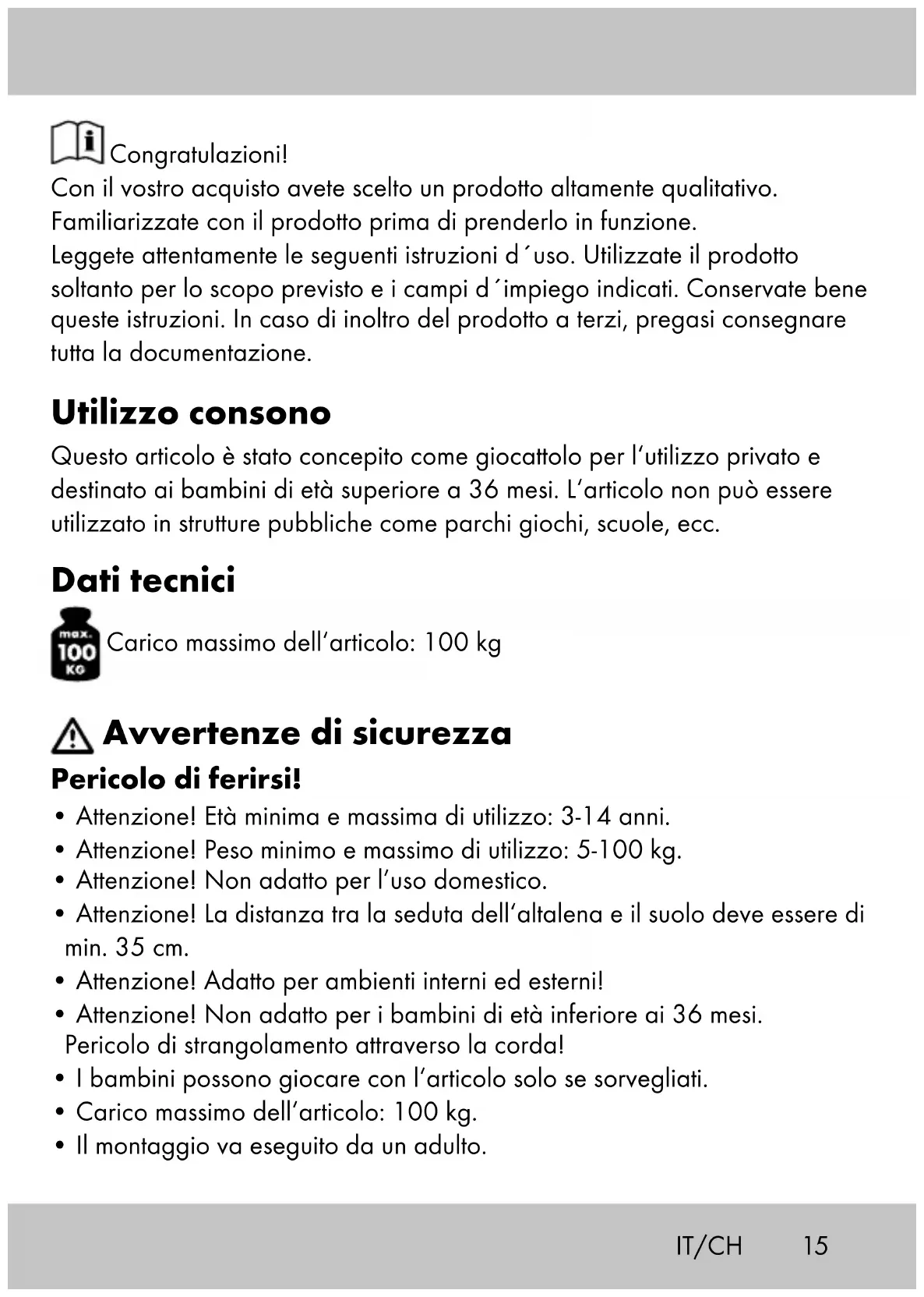 - Carico massimo dell‘articolo: 100 kg.