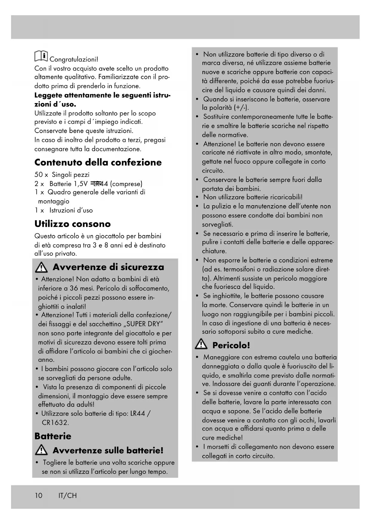 - s‘il correspond à la description donnée par le vendeur et posséder les qualités que celui-ci a présentées à l‘acheteur sous forme d‘échantillon ou de modèle ;10 Congratulazioni! Con il vostro acquisto avete scelto un prodotto altamente qualitativo. Familiarizzate con il pro- dotto prima di prenderlo in funzione. Leggete attentamente le seguenti istru- zioni d´uso. Utilizzate il prodotto soltanto per lo scopo previsto e i campi d´impiego indicati. Conservate bene queste istruzioni. In caso di inoltro del prodotto a terzi, pregasi consegnare tutta la documentazione. Contenuto della confezione 50 x Singoli pezzi 2 x Batterie 1,5V LR44 (comprese) 1 x Quadro generale delle varianti di montaggio 1 x Istruzioni d‘uso Utilizzo consono Questo articolo è un giocattolo per bambini di età compresa tra 3 e 8 anni ed è destinato all’uso privato. Avvertenze di sicurezza