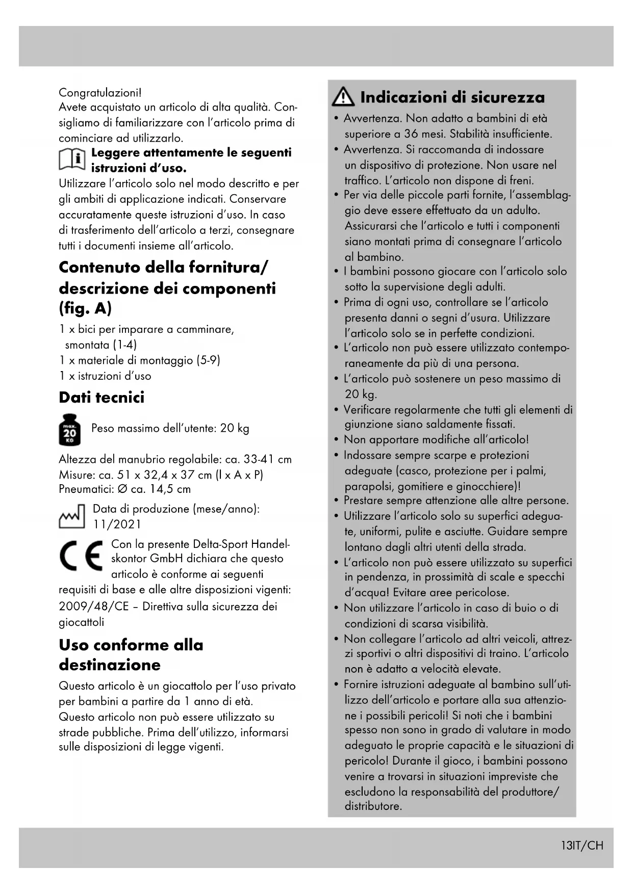 acciaio (7). Impostazione della colonna di guida (fig. D) Per impostare la capacità di guida del manu- brio, serrare la vite di blocco (7a) della fascetta in acciaio (7). Nota: Se il manubrio ha troppa libertà di movimento, serrare maggiormente la vite di blocco (7a). Se il manubrio è troppo rigido, allentare il dado. Rispettare la demarcazione dell’inseri- mento minimo sul manubrio! Conservazione, pulizia In caso di mancato utilizzo, riporre l’articolo a temperatura ambiente in un luogo asciutto e pulito. Pulire solo con un panno asciutto. IMPORTANTE! Non utilizzare mai detergenti aggressivi. Smaltimento Smaltire l‘articolo e i materiali dell‘imballaggio in conformità con le direttive locali in vigore. I materiali di imballaggio, come ad esempio le pellicole, non devono essere alla portata dei bambini. Conservare i materiali di imballaggio in un luogo non raggiungibile per i bambini. Smaltire i prodotti e gli imballaggi in modo ecologico. Il codice di riciclaggio ha lo scopo di contrassegnare i diversi materiali al fine di introdurli nel ciclo di riutilizzo (recycling). Il codice è composto dal simbolo del riciclo, che dovrebbe rappresentare il ciclo del riutilizzo, e un numero che indica di che materiale si tratta. Avvertenze sulla garanzia e sulla gestione dei servizi di assistenza L’articolo è stato prodotto con la massima cura e sotto un continuo controllo. DELTA-SPORT HAN- DELSKONTOR GmbH concede ai clienti finali privati, su questo articolo, tre anni di garanzia dalla data di acquisto (termine di garanzia) sul- la base delle seguenti disposizioni. La garanzia vale solo per i vizi di materiale e di lavorazione. La garanzia non si estende alle parti soggette ad un normale degradamento e che siano quindi da considerarsi come pezzi soggetti ad usura (ad es. le batterie) né ai pezzi fragili come ad es. interruttori, batterie ricaricabili oppure pezzi in vetro. IT/CH15IT/CH Dalla presente garanzia sono escluse le richieste legate a casi di utilizzo non conforme oppure di abuso dell’articolo, oppure di utilizzo avvenuto non nell’ambito delle condizioni previste oppure del campo di impiego previsto, oppure in caso di non osservanza delle direttive riportate nelle istruzioni d’uso, a meno che il cliente non dimostri che sussista un vizio di materiale o di lavorazione che non sia riconducibile ad una delle circostanze riportate sopra. Le richieste di garanzia possono essere avanza- te solo entro il relativo termine, su presentazione dello scontrino originale di acquisto. Si prega quindi di conservare lo scontrino originale. Il ter- mine di garanzia non sarà prolungato a seguito di eventuali riparazioni effettuate sulla base della garanzia, della garanzia obbligatoria prevista per legge oppure di accondiscendenza. Ciò vale anche per le parti sostituite oppure riparate. In caso di contestazione rivolgersi dapprima alla hotline di assistenza sotto indicata oppure mettersi in contatto con noi via e-mail. Laddove sussista un caso coperto dalla garanzia, l’artico- lo sarà – a nostra discrezione – da noi riparato gratuitamente, sostituito oppure sarà rimborsato il prezzo di acquisto. Non sussistono ulteriori diritti derivanti dalla garanzia. I vostri diritti giuridici, in particolare i diritti di garanzia obbligatoria prevista dalla legge nei confronti del relativo venditore, non sono limitati dalla presente garanzia. IAN: 386411_2104 Assistenza Svizzera Tel.: 0842 665566 (0,08 CHF/Min., telefonia mobile max. 0,40 CHF/Min.) E-Mail: deltasport@lidl.ch16 Congratulations! You have chosen to purchase a high-quality product. Familiarise yourself with the product before using it for the first time. Read the following instructions for use carefully. Use the product only as described and only for the given areas of application. Store these instructions for use carefully. When passing the product on to third parties, please also hand over all accompanying documents. Package contents/parts list (Fig. A) 1 x balance bike, disassembled (1–4) 1 x assembly materials (5–9) 1 x instructions for use Technical data Maximum user weight: 20kg Adjustable handlebar height: approx. 33–41cm Dimensions: approx. 51 x 32.4 x 37cm (W x H x D) Tyres: Ø approx. 14.5cm Date of manufacture (month/year): 11/2021 UK Conformity Assessed Delta-Sport Handelskontor GmbH hereby declares that this product meets the following basic requirements, as well as other important regulations: Toys (Safety) Regulations 2011 Delta-Sport Handelskontor GmbH hereby declares that this product conforms to the following basic requirements and other applicable regulations: Directive 2009/48/EC on the safety of toys Intended use This product is a toy for children 1 year of age and older, for private use. This product must not be used on public roads. Familiarise yourself with the statutory regulations before using the product. Safety information