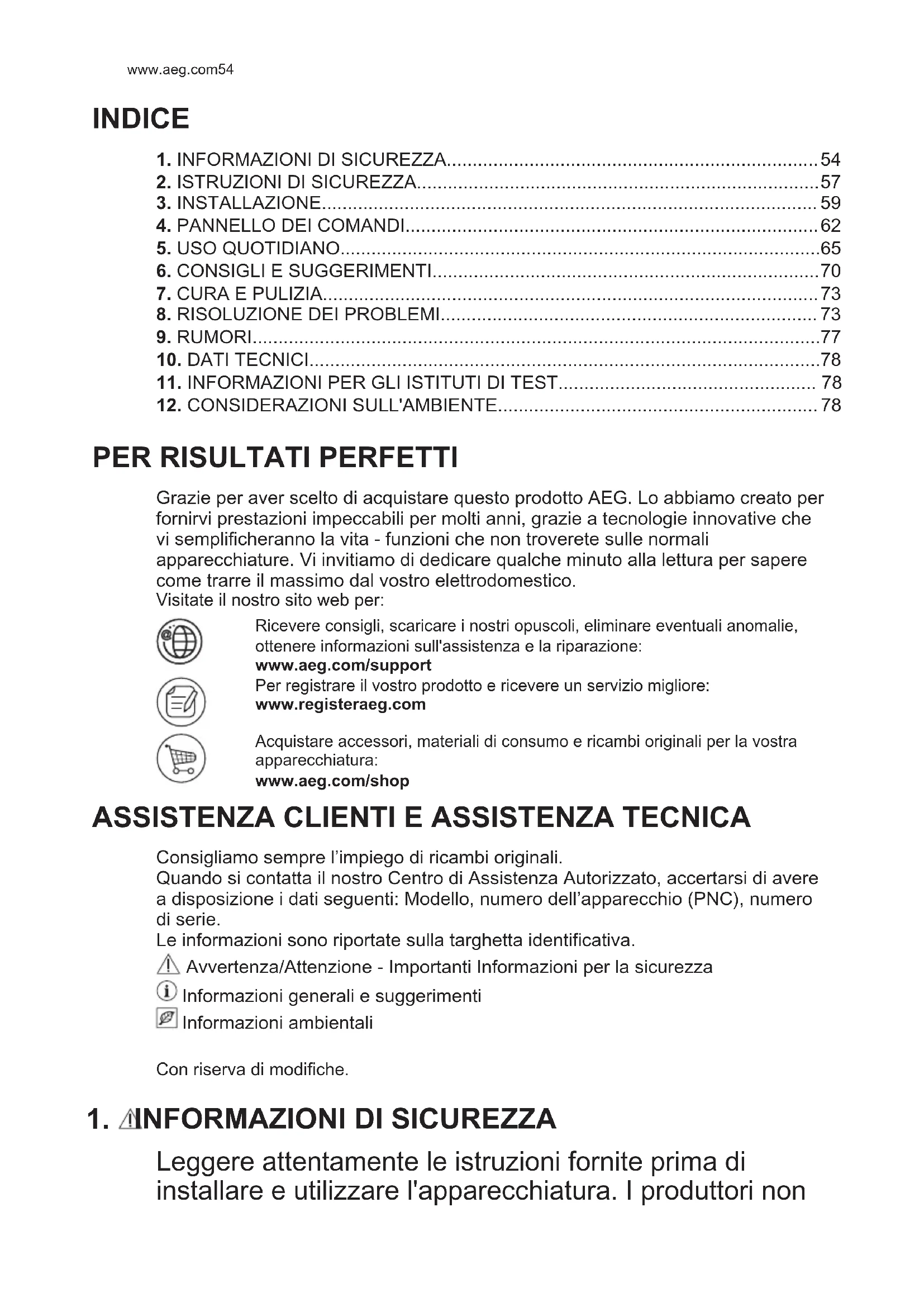 Leggere attentamente le istruzioni fornite prima di installare e utilizzare l'apparecchiatura. I produttori non www.aeg.com54sono responsabili di eventuali lesioni o danni derivanti da un'installazione o un uso scorretti. Conservare sempre le istruzioni in un luogo sicuro e accessibile per poterle consultare in futuro.