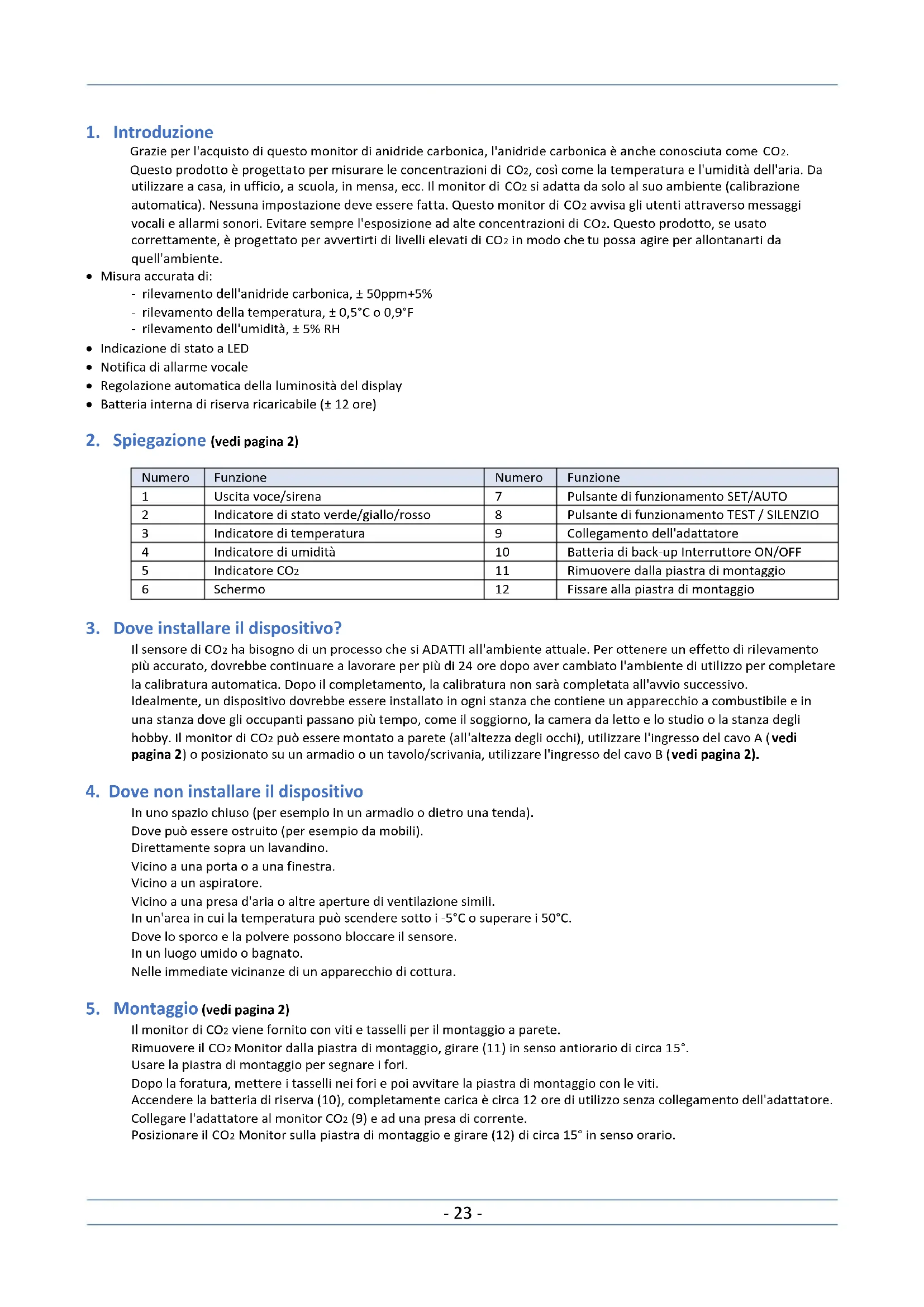 Grazie per l'acquisto di questo monitor di anidride carbonica, l'anidride carbonica è anche conosciuta come CO2. Questo prodotto è progettato per misurare le concentrazioni di CO2, così come la temperatura e l'umidità dell'aria. Da utilizzare a casa, in ufficio, a scuola, in mensa, ecc. Il monitor di CO2 si adatta da solo al suo ambiente (calibrazione automatica). Nessuna impostazione deve essere fatta. Questo monitor di CO2 avvisa gli utenti attraverso messaggi vocali e allarmi sonori. Evitare sempre l'esposizione ad alte concentrazioni di CO2. Questo prodotto, se usato correttamente, è progettato per avvertirti di livelli elevati di CO2 in modo che tu possa agire per allontanarti da quell'ambiente.