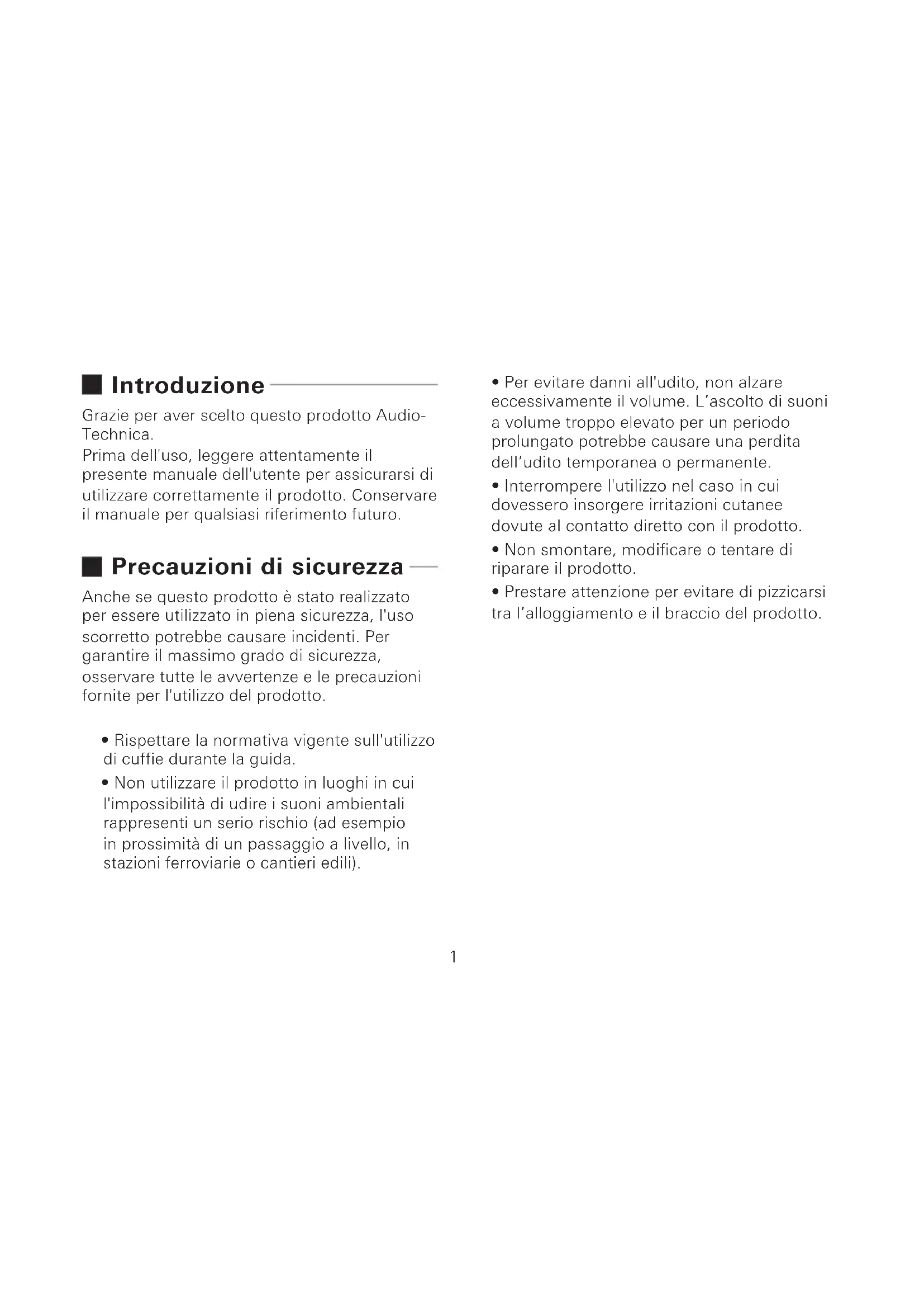 MEMO1 Introduzione Grazie per aver scelto questo prodotto Audio- Technica. Prima dell'uso, leggere attentamente il presente manuale dell'utente per assicurarsi di utilizzare correttamente il prodotto. Conservare il manuale per qualsiasi riferimento futuro. Precauzioni di sicurezza Anche se questo prodotto è stato realizzato per essere utilizzato in piena sicurezza, l'uso scorretto potrebbe causare incidenti. Per garantire il massimo grado di sicurezza, osservare tutte le avvertenze e le precauzioni fornite per l'utilizzo del prodotto.