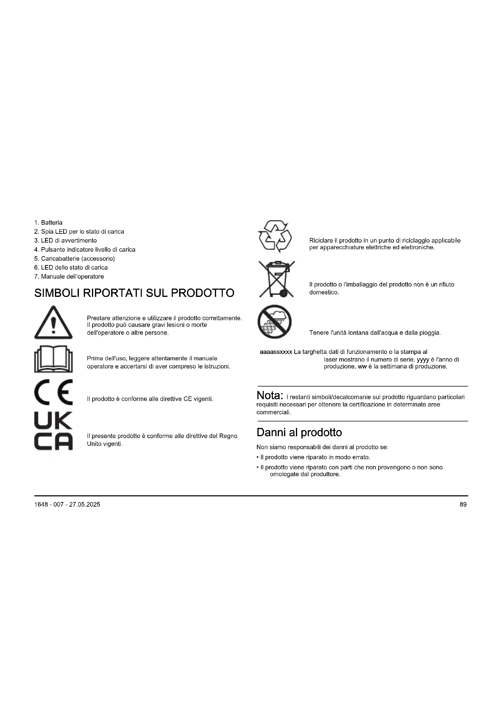 Prestare attenzione e utilizzare il prodotto correttamente. Il prodotto può causare gravi lesioni o morte dell'operatore o altre persone. Prima dell'uso, leggere attentamente il manuale operatore e accertarsi di aver compreso le istruzioni. Il prodotto è conforme alle direttive CE vigenti. Il presente prodotto è conforme alle direttive del Regno Unito vigenti. Riciclare il prodotto in un punto di riciclaggio applicabile per apparecchiature elettriche ed elettroniche. Il prodotto o l'imballaggio del prodotto non è un rifiuto domestico. Tenere l'unità lontana dall'acqua e dalla pioggia. aaaassxxxx La targhetta dati di funzionamento o la stampa al laser mostrano il numero di serie. yyyy è l'anno di produzione, ww è la settimana di produzione. Nota: I restanti simboli/decalcomanie sul prodotto riguardano particolari requisiti necessari per ottenere la certificazione in determinate aree commerciali. Danni al prodotto Non siamo responsabili dei danni al prodotto se: