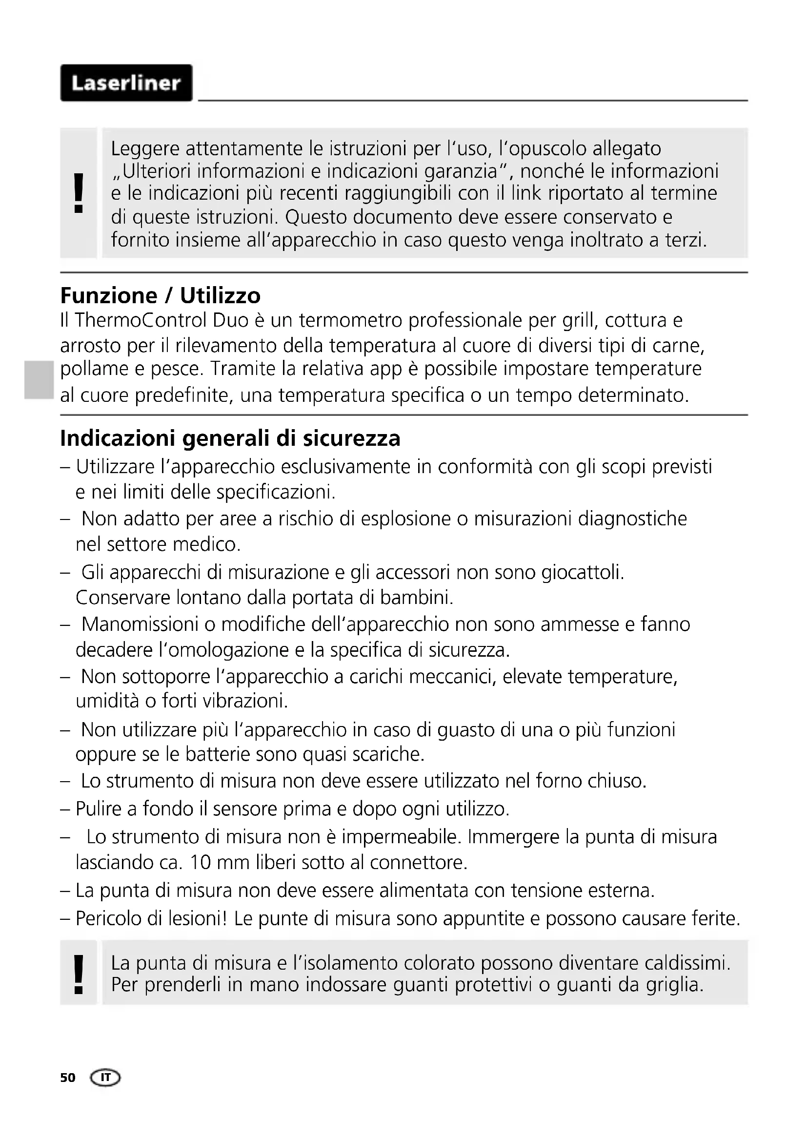 Scarica le istruzioni per il tuo Termometro per alimenti in formato PDF gratuitamente! Trova il tuo manuale ThermoControl Duo - Laserliner e riprendi in mano il tuo dispositivo elettronico. In questa pagina sono pubblicati tutti i documenti necessari per l'utilizzo del tuo dispositivo. ThermoControl Duo del marchio Laserliner.