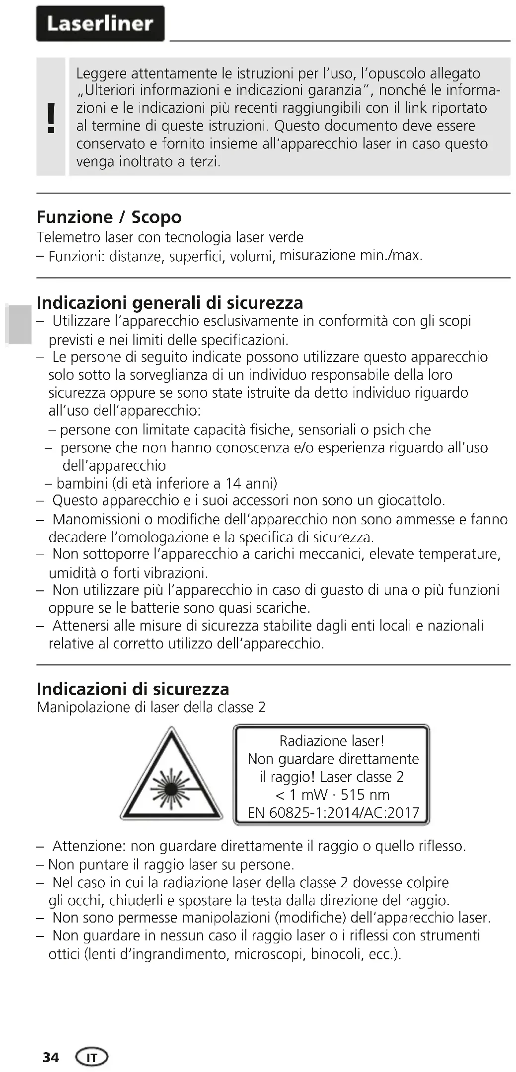 – Attenzione: non guardare direttamente il raggio o quello riesso. – Non puntare il raggio laser su persone. – Nel caso in cui la radiazione laser della classe 2 dovesse colpire gli occhi, chiuderli e spostare la testa dalla direzione del raggio. – Non sono permesse manipolazioni (modiche) dell‘apparecchio laser. – Non guardare in nessun caso il raggio laser o i riessi con strumenti ottici (lenti d‘ingrandimento, microscopi, binocoli, ecc.). Radiazione laser! Non guardare direttamente il raggio! Laser classe 2 < 1 mW · 515 nm EN 60825-1:2014/AC:2017 Indicazioni di sicurezza Manipolazione di laser della classe 2 Indicazioni generali di sicurezza – Utilizzare l‘apparecchio esclusivamente in conformità con gli scopi previsti e nei limiti delle specicazioni. – Le persone di seguito indicate possono utilizzare questo apparecchio solo sotto la sorveglianza di un individuo responsabile della loro sicurezza oppure se sono state istruite da detto individuo riguardo all’uso dell’apparecchio: – persone con limitate capacità siche, sensoriali o psichiche – persone che non hanno conoscenza e/o esperienza riguardo all’uso dell’apparecchio – bambini (di età inferiore a 14 anni) – Questo apparecchio e i suoi accessori non sono un giocattolo. – Manomissioni o modiche dell‘apparecchio non sono ammesse e fanno decadere l‘omologazione e la specica di sicurezza. – Non sottoporre l‘apparecchio a carichi meccanici, elevate temperature, umidità o forti vibrazioni. – Non utilizzare più l‘apparecchio in caso di guasto di una o più funzioni oppure se le batterie sono quasi scariche. – Attenersi alle misure di sicurezza stabilite dagli enti locali e nazionali relative al corretto utilizzo dell‘apparecchio. Telemetro laser con tecnologia laser verde