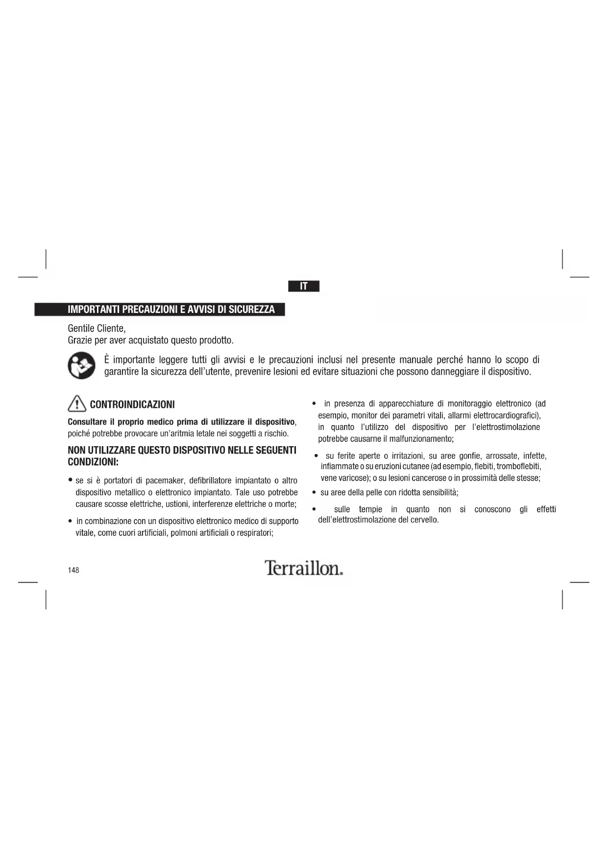 Gentile Cliente, Grazie per aver acquistato questo prodotto. È importante leggere tutti gli avvisi e le precauzioni inclusi nel presente manuale perché hanno lo scopo di garantire la sicurezza dell’utente, prevenire lesioni ed evitare situazioni che possono danneggiare il dispositivo. CONTROINDICAZIONI Consultare il proprio medico prima di utilizzare il dispositivo, poiché potrebbe provocare un’aritmia letale nei soggetti a rischio.