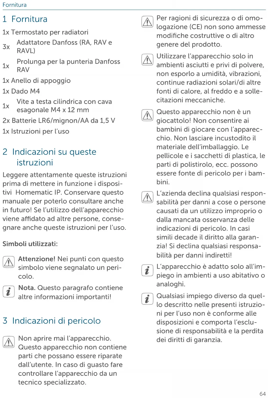 Vite a testa cilindrica con cava esagonale M4 x 12 mm 2x Batterie LR6/mignon/AA da 1,5 V 1x Istruzioni per l’uso 2 Indicazioni su queste istruzioni Leggere attentamente queste istruzioni prima di mettere in funzione i disposi- tivi HomematicIP. Conservare questo manuale per poterlo consultare anche in futuro! Se l’utilizzo dell’apparecchio viene adato ad altre persone, conse- gnare anche queste istruzioni per l’uso. Simboli utilizzati: Attenzione! Nei punti con questo simbolo viene segnalato un peri- colo. Nota. Questo paragrafo contiene altre informazioni importanti! 3 Indicazioni di pericolo Non aprire mai l’apparecchio. Questo apparecchio non contiene parti che possano essere riparate dall’utente. In caso di guasto fare controllare l’apparecchio da un tecnico specializzato. Per ragioni di sicurezza o di omo- logazione (CE) non sono ammesse modifiche costruttive o di altro genere del prodotto. Utilizzare l’apparecchio solo in ambienti asciutti e privi di polvere, non esporlo a umidità, vibrazioni, continue radiazioni solari/di altre fonti di calore, al freddo e a solle- citazioni meccaniche. Questo apparecchio non è un giocattolo! Non consentire ai bambini di giocare con l’apparec- chio. Non lasciare incustodito il materiale dell’imballaggio. Le pellicole e i sacchetti di plastica, le parti di polistirolo, ecc. possono essere fonte di pericolo per i bam- bini. L’azienda declina qualsiasi respon- sabilità per danni a cose o persone causati da un utilizzo improprio o dalla mancata osservanza delle indicazioni di pericolo. In casi simili decade il diritto alla garan- zia! Si declina qualsiasi responsa- bilità per danni indiretti! L’apparecchio è adatto solo all’im- piego in ambienti a uso abitativo o analoghi. Qualsiasi impiego diverso da quel- lo descritto nelle presenti istruzio- ni per l’uso non è conforme alle disposizioni e comporta l’esclu- sione di responsabilità e la perdita dei diritti di garanzia.65 Funzioni e vista d’insieme dell’apparecchio 4 Funzioni e vista d’insieme dell’apparecchio Con il termostato per radiatori Home- matic IP è possibile regolare con tem- porizzatore la temperatura degli am- bienti, tramite la app per smartphone HomematicIP, ed è possibile adattare le varie fasi di riscaldamento alle esi- genze personali. Se necessario, è pos- sibile creare tre diversi profili di riscal- damento con fino a massimo 6 fasi di riscaldamento al giorno. Nella soluzione per il microclima il termostato per radiatori può esse- re facilmente inizializzato nell’Access Point HomematicIP e utilizzato per abbassare automaticamente la tempe- ratura durante l’aerazione, ad esempio in abbinamento al contatto per porte e finestre HomematicIP. Per rego- lare con precisione la temperatura degli ambienti, il termostato a parete HomematicIP con sensore di umidità dell’aria può rilevare la temperatura eettiva del locale per poi trasmettere questo dato ai termostati per radiatori. In questo modo si garantisce la misu- razione della temperatura nel punto giusto di ogni ambiente. Il termostato per radiatori è adatto a tutte le valvole per caloriferi attual- mente in uso e si installa facilmente poiché non è necessario scaricare acqua dal calorifero né intervenire sul sistema di riscaldamento. Inoltre la funzione Boost aggiunta consente di riscaldare rapidamente il radiatore per alcuni minuti aprendo la valvola. Vista d’insieme dell’apparecchio: (A) Dado di metallo (B) Display (C) Tasto di sistema (tasto di inizializza- zione e LED) (D) Coperchio del vano batterie (E) Manopola di regolazione/tasto Bo- ost Figura 1