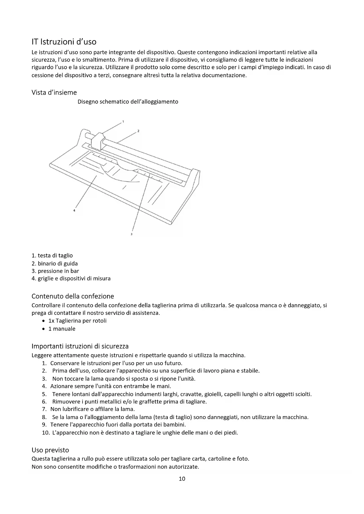 Uso previsto Questa taglierina a rullo può essere utilizzata solo per tagliare carta, cartoline e foto. Non sono consentite modifiche o trasformazioni non autorizzate.11 Uso improprio Tagliare solo materiali conformi alle specifiche indicate nei dati tecnici. Qualsiasi uso diverso da quello descritto nella sezione "Uso previsto" è considerato un uso improprio. Pulizia dell'apparecchio Attenzione: pericolo di lesioni! Il coltello a bobina è molto affilato! Pulire con cura il coltello del mulinello! Pulire l'esterno dell'unità con un panno leggermente umido. Non utilizzare prodotti aggressivi o chimici per pulire l'unità. Taglierina per rotoli