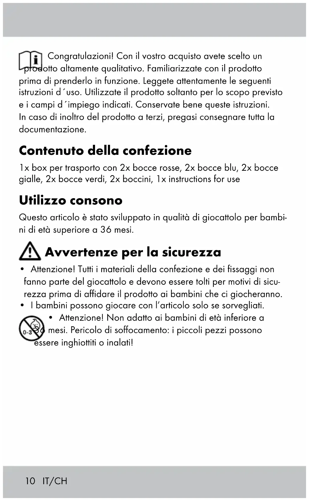 - Attenzione! Non adatto ai bambini di età inferiore a 36 mesi. Pericolo di soffocamento: i piccoli pezzi possono essere inghiottiti o inalati!11 IT/CH Il gioco Queste istruzioni trattano solo le regole di base per principianti e sono particolarmente adatte ai bambini. Consultare le pubblicazioni specializzate per apprendere le regole internazionali del gioco delle bocce. Ogni giocatore riceve due bocce del medesimo colore. Lo scopo del gioco è piazzare le proprie bocce il più vicino possibile alla boccia più piccola, ovvero al boccino. Stabilire una linea di partenza dietro alla quale tutti i giocatori lance- ranno le loro bocce. Nella prima tornata si lancia il boccino. Il giocatore che ha lanciato il boccino è il primo a lanciare la propria boccia. Dopodiché tutti gli altri giocatori lanciano, uno dopo l’altro, una boccia tentando di piazzarla il più vicino possibile al boccino oppure di colpire una boccia avversaria per allontanarla dal boccino. Nella seconda tornata tutti i giocatori lanciano la loro seconda boccia nella medesima successione. Il giocatore che dopo la seconda tornata è riuscito a piazzare la propria boccia più vicino al boccino ottiene un punto. Stabilire prima di iniziare il gioco quanti punti è necessario totalizzare per vincere la partita. Cura, conservazione Conservare l’articolo sempre all‘asciutto e al pulito in un ambiente temperato. Importante! Pulire solo con un panno umido e asciugare quindi con un panno asciutto. Smaltimento Smaltire l’imballaggio e l’articolo stesso rispettando l’ambiente e le regole della raccolta differenziata! Per lo smaltimento rivolgersi ad un’azienda autorizzata o alle autorità competenti. Rispettare la normativa vigente12 3 anni di garanzia Questo prodotto è stato fabbricato con grande attenzione e sottoposto a costanti controlli. La garanzia è di tre anni dalla data d’acquisto. Conservi lo scontrino fiscale. La garanzia vale solo su difetti di materiale o di fabbricazione e decade in caso di uso errato o non conforme. Questa garanzia non costituisce una limitazione ai Suoi diritti legali e in particolare al diritto di garanzia. Per eventuali reclami vi preghiamo di contattare il seguente servizio hotline o mettervi in comunicazione con noi via e-mail. I nostri addetti all‘assistenza concorderanno con voi come procedere nel modo più rapido possibile. In qualsiasi caso vi consiglieremo per le vostre esigenze specifiche. Il periodo di garanzia non viene prolungato a seguito di riparazioni effettuate in garanzia, secondo il diritto di garanzia o per cor- rentezza commerciale. Lo stesso vale anche per le parti sostituite o riparate. Le riparazioni dopo la scadenza della garanzia verranno effettuate a pagamento. IAN: 86431 Assistenza Svizzera Tel.: 0842 665566 (0,08 CHF/Min., telefonia mobile max. 0,40 CHF/Min.) E-Mail: deltasport@lidl.ch E‘ possibile trovare i pezzi di ricambio del vostro prodotto anche su: www.delta-sport.com, rubrica servizio di assistenza - pezzi di ricambio Lidl IT/CH13 Hartelijk gefeliciteerd! Met de aankoop hebt u gekozen voor een hoogwaardig product. Maak u daarom voor de eerste ingebruikname vertrouwd met het product. Lees hiervoor deze gebruiksaanwijzing aandachtig door. Gebruik het product alleen zoals beschreven en uitsluitend voor de aangegeven doeleinden. Bewaar de handleiding zorgvuldig. Als u het product aan derden geeft, dient u ook deze documenten te overhandigen. Leveringsomvang 1 x draagbox met 2 x rode kogels, 2 x blauwe kogels, 2 x gele kogels, 2 x groene kogels, 2 x doelkogels, 1 x gebruiksaanwijzing Reglementair gebruik Dit artikel werd als speelgoed voor kinderen van 36 maanden en ouder ontwikkeld. Veiligheidsadviezen