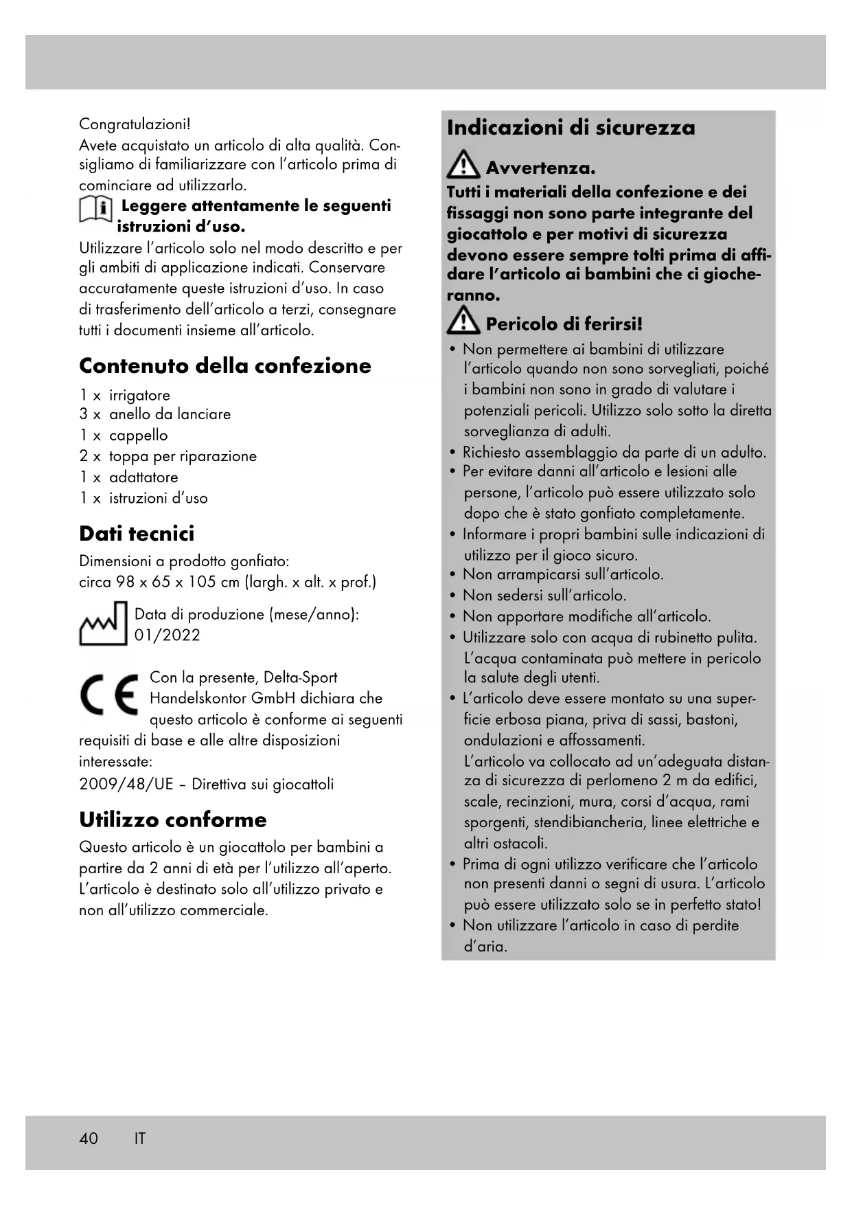 zona danneggiata e premere con forza. Conservazione, pulizia In caso di non utilizzo, conservare l’articolo sempre sgonfiato, asciutto e pulito a temperatura ambiente. Durante la conservazione le valvole devono essere sempre chiuse. Quando l‘articolo viene messo via, le valvole devono sempre essere chiuse. Quando si mette via l‘articolo per l‘inverno, non poggiare articoli taglienti sopra all‘articolo, né applicare del talco. Smaltimento Smaltire l‘articolo e i materiali dell‘imballaggio in conformità con le direttive locali in vigore. I materiali di imballaggio, come ad esempio le pellicole, non devono essere alla portata dei bambini. Conservare i materiali di imballaggio in un luogo non raggiungibile per i bambini. Smaltire i prodotti e gli imballaggi in modo ecologico. Il codice di riciclaggio ha lo scopo di contrassegnare i diversi materiali al fine di introdurli nel ciclo di riutilizzo (recycling). Il codice è composto dal simbolo del riciclo, che dovrebbe rappresentare il ciclo del riutilizzo, e un numero che indica di che materiale si tratta. Avvertenze sulla garanzia e sulla gestione dei servizi di assistenza L’articolo è stato prodotto con la massima cura e sotto un continuo controllo. DELTA-SPORT HAN- DELSKONTOR GmbH concede ai clienti finali privati, su questo articolo, tre anni di garanzia dalla data di acquisto (termine di garanzia) sul- la base delle seguenti disposizioni. La garanzia vale solo per i vizi di materiale e di lavorazione. La garanzia non si estende alle parti soggette ad un normale degradamento e che siano quindi da considerarsi come pezzi soggetti ad usura (ad es. le batterie) né ai pezzi fragili come ad es. interruttori, batterie ricaricabili oppure pezzi in vetro. IT43 Dalla presente garanzia sono escluse le richieste legate a casi di utilizzo non conforme oppure di abuso dell’articolo, oppure di utilizzo avvenuto non nell’ambito delle condizioni previste oppure del campo di impiego previsto, oppure in caso di non osservanza delle direttive riportate nelle istruzioni d’uso, a meno che il cliente non dimostri che sussista un vizio di materiale o di lavorazione che non sia riconducibile ad una delle circostanze riportate sopra. Le richieste di garanzia possono essere avanza- te solo entro il relativo termine, su presentazione dello scontrino originale di acquisto. Si prega quindi di conservare lo scontrino originale. Il ter- mine di garanzia non sarà prolungato a seguito di eventuali riparazioni effettuate sulla base della garanzia, della garanzia obbligatoria prevista per legge oppure di accondiscendenza. Ciò vale anche per le parti sostituite oppure riparate. In caso di contestazione rivolgersi dapprima alla hotline di assistenza sotto indicata oppure mettersi in contatto con noi via e-mail. Laddove sussista un caso coperto dalla garanzia, l’artico- lo sarà – a nostra discrezione – da noi riparato gratuitamente, sostituito oppure sarà rimborsato il prezzo di acquisto. Non sussistono ulteriori diritti derivanti dalla garanzia. I vostri diritti giuridici, in particolare i diritti di garanzia obbligatoria prevista dalla legge nei confronti del relativo venditore, non sono limitati dalla presente garanzia. IAN: 398788_2107 Assistenza Italia Tel.: 02 36003201 E-Mail: deltasport@lidl.it IT44 Szívből gratulálunk! Vásárlásával kiváló minőségű terméket válasz- tott. Használatba vétele előtt ismerkedjen meg a termékkel. Figyelmesen olvassa el az alábbi használati útmutatót. A terméket kizárólag az itt ismertetett módon, a rendeltetésének megfelelően használja. Gondo- san őrizze meg a használati útmutatót. A termék továbbadásakor adja át az összes kapcsolódó dokumentumot is. A csomag tartalma 1 x vízpermetező 3 x dobókarika 1 x kalap 2 x javítótapasz 1 x adapter 1 x használati útmutató Műszaki adatok Méretek felfújt állapotban: kb. 98 x 65 x 105 cm (Szé x Ma x Mé) Gyártás dátuma (hónap/év): 01/2022 A Delta-Sport Handelskontor GmbH ezennel kijelenti, hogy ez a termék megfelel a következő alapvető követelményeknek és az egyéb, vonatkozó rendelkezéseknek: 2009/48/EU – játékokra vonatkozó irányelv Rendeltetésszerű használat 2 éven felüli gyermekeknek ajánlott játék kültéri használatra. A termék kizárólag személyes és nem kereske- delmi célú felhasználásra készült.