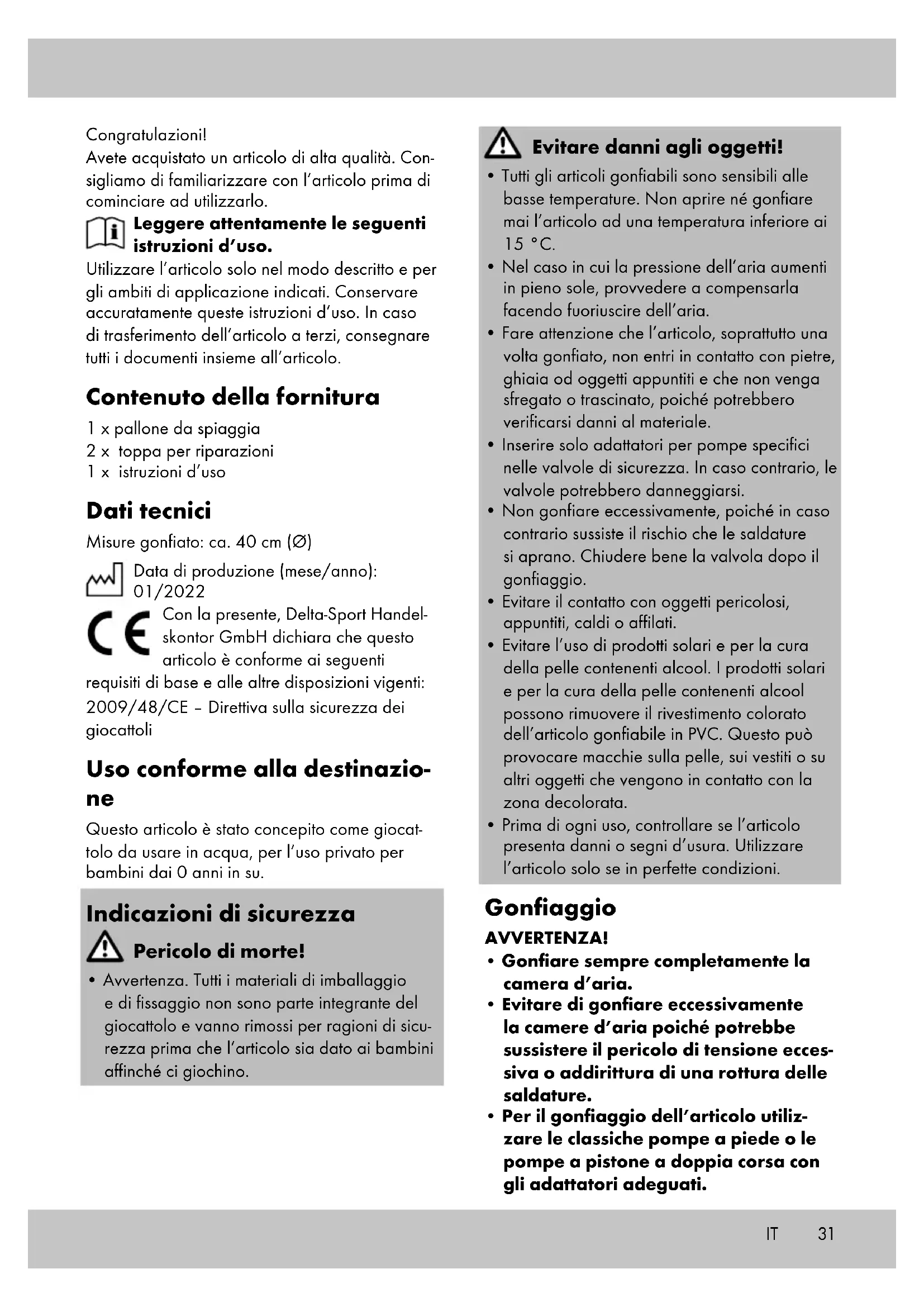 - Separare la toppa dalla carta, fissarla sulla zona danneggiata e premere forte. Conservazione, pulizia In caso di mancato utilizzo, riporre l’articolo sgonfiato a temperatura ambiente in un luogo asciutto e pulito. Durante la conservazione la valvola deve essere sempre chiusa. Quando l’articolo è riposto per l’inverno, non porre su di esso oggetti aguzzi e non cospargerlo di talco. Pulire solo con un panno umido e quindi asciu- gare. IMPORTANTE! Non utilizzare mai detergenti aggressivi. Smaltimento Smaltire l‘articolo e i materiali dell‘imballaggio in conformità con le direttive locali in vigore. I materiali di imballaggio, come ad esempio le pellicole, non devono essere alla portata dei bambini. Conservare i materiali di imballaggio in un luogo non raggiungibile per i bambini. Smaltire i prodotti e gli imballaggi in modo ecologico. Il codice di riciclaggio ha lo scopo di contrassegnare i diversi materiali al fine di introdurli nel ciclo di riutilizzo (recycling). Il codice è composto dal simbolo del riciclo, che dovrebbe rappresentare il ciclo del riutilizzo, e un numero che indica di che materiale si tratta. Avvertenze sulla garanzia e sulla gestione dei servizi di assistenza L’articolo è stato prodotto con la massima cura e sotto un continuo controllo. DELTA-SPORT HAN- DELSKONTOR GmbH concede ai clienti finali privati, su questo articolo, tre anni di garanzia dalla data di acquisto (termine di garanzia) sul- la base delle seguenti disposizioni. La garanzia vale solo per i vizi di materiale e di lavorazione. La garanzia non si estende alle parti soggette ad un normale degradamento e che siano quindi da considerarsi come pezzi soggetti ad usura (ad es. le batterie) né ai pezzi fragili come ad es. interruttori, batterie ricaricabili oppure pezzi in vetro. Dalla presente garanzia sono escluse le richieste legate a casi di utilizzo non conforme oppure di abuso dell’articolo, oppure di utilizzo avvenuto non nell’ambito delle condizioni previste oppure del campo di impiego previsto, oppure in caso di non osservanza delle direttive riportate nelle istruzioni d’uso, a meno che il cliente non dimostri che sussista un vizio di materiale o di lavorazione che non sia riconducibile ad una delle circostanze riportate sopra.33 Le richieste di garanzia possono essere avanza- te solo entro il relativo termine, su presentazione dello scontrino originale di acquisto. Si prega quindi di conservare lo scontrino originale. Il ter- mine di garanzia non sarà prolungato a seguito di eventuali riparazioni effettuate sulla base della garanzia, della garanzia obbligatoria prevista per legge oppure di accondiscendenza. Ciò vale anche per le parti sostituite oppure riparate. In caso di contestazione rivolgersi dapprima alla hotline di assistenza sotto indicata oppure mettersi in contatto con noi via e-mail. Laddove sussista un caso coperto dalla garanzia, l’artico- lo sarà – a nostra discrezione – da noi riparato gratuitamente, sostituito oppure sarà rimborsato il prezzo di acquisto. Non sussistono ulteriori diritti derivanti dalla garanzia. I vostri diritti giuridici, in particolare i diritti di garanzia obbligatoria prevista dalla legge nei confronti del relativo venditore, non sono limitati dalla presente garanzia. IAN: 399689_2107 Assistenza Italia Tel.: 02 36003201 E-Mail: deltasport@lidl.it IT34 HU Szívből gratulálunk! Vásárlásával kiváló minőségű terméket válasz- tott. Használatba vétele előtt ismerkedjen meg a termékkel. Figyelmesen olvassa el az alábbi használati útmutatót. A terméket kizárólag az itt ismertetett módon, a rendeltetésének megfelelően használja. Gondo- san őrizze meg a használati útmutatót. A termék továbbadásakor adja át az összes kapcsolódó dokumentumot is. Csomag tartalma 1 x strandlabda 2 x javítófolt 1 x használati útmutató Műszaki adatok Méret, felfújva: kb. 40 cm (Ø) Gyártási dátum (hónap/év): 01/2022 A Delta-Sport Handelskontor GmbH kijelenti, hogy a termék megfelel az alábbi általános követelményeknek és az egyéb vonatkozó rendelkezéseknek: 2009/48/EK – Irányelv a játékok biztonságáról Rendeltetésszerű használat A termék játékszer nulla éves vagy annál idősebb gyermekek számára, vízben történő, magáncélú használatra tervezve. Biztonsági utasítások Életveszély!