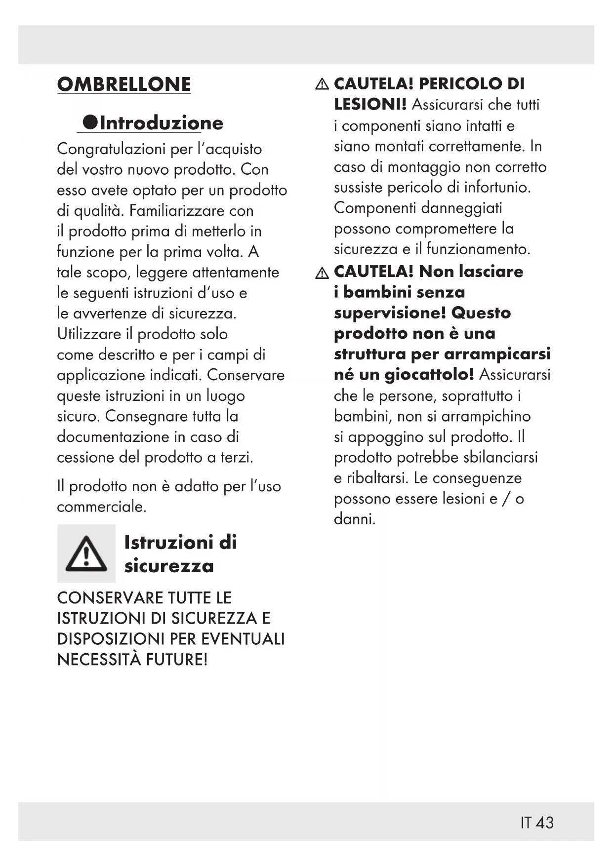 OMBRELLONE Introduzione Congratulazioni per l‘acquisto del vostro nuovo prodotto. Con esso avete optato per un prodotto di qualità. Familiarizzare con il prodotto prima di metterlo in funzione per la prima volta. A tale scopo, leggere attentamente le seguenti istruzioni d‘uso e le avvertenze di sicurezza. Utilizzare il prodotto solo come descritto e per i campi di applicazione indicati. Conservare queste istruzioni in un luogo sicuro. Consegnare tutta la documentazione in caso di cessione del prodotto a terzi. Il prodotto non è adatto per l’uso commerciale. Istruzioni di sicurezza