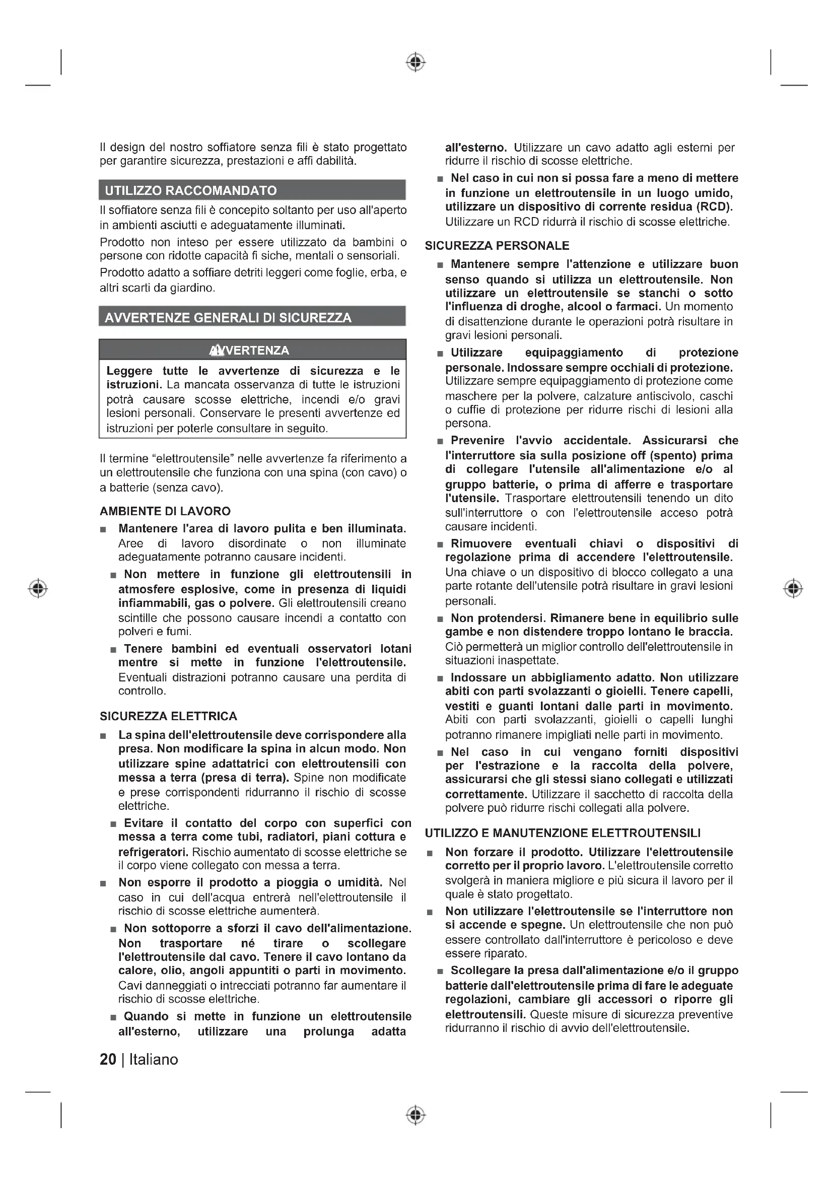 ZA FILI ■ In alcune regioni norme specifiche limitano l'utilizzo del prodotto ad alcune operazioni. Controllare con le autorità locali per avere ulteriori informazioni a riguardo ■ Non lasciare mai che bambini, persone con ridotte capacità fisiche, sensoriali o mentali o mancanza di esperienza e conoscenza o persone non familiari con queste istruzioni utilizzino il prodotto. Leggi locali possono limitare l’età dell’operatore. ■ Ricordare che l’operatore sarà responsabile di eventuali lesioni o danni a persone o cose. ■ Tenere osservatori, bambini e animali ad almeno 15 metri di distanza dall'area delle operazioni. Arrestare il prodotto nel caso in cui eventuali osservatori entrino nell'area di lavoro. ■ Mentre si mette in funzione il prodotto indossare sempre calzature resistenti e pantaloni lunghi. Non mettere in funzione l'utensile se scalzi o se si indossano sandali. Evitare di indossare abbigliamento con parti svolazzanti o con cordicelle o cordini pendenti; tali elementi potranno infatti rimanere impigliati nelle parti in movimento. ■ Non indossare abiti con parti svolazzanti o gioielli che potranno essere aspirati nelle griglie dell'aria. ■ Assicurare i capelli lunghi al di sopra delle spalle per evitare che rimangano impigliati nelle parti in movimento. ■ Indossare sempre cuffie per le orecchie mentre si mette in funzione il prodotto. Il prodotto è estremamente rumoroso e potrà causare lesioni permanenti all'udito se le istruzioni riguardanti il limite all'esposizione, la riduzione del rumore e le cuffie di protezione non verranno seguite. ■ Indossare sempre la protezione completa occhi mentre si utilizza questo prodotto. La ditta produttrice raccomanda di utilizzare una maschera per il volto o visiere ermeticamente chiuse. Normali occhiali scuri o da sole non costituiscono una protezione adeguata. Oggetti potranno essere scagliati ad alta velocità dal potente getto d'aria in un qualsiasi momento e potranno essere scagliati da superfici dure contro l'operatore. ■ Assicurarsi prima di ciascun utilizzo che tutti i comandi e i dispositivi di sicurezza funzionino correttamente. Non utilizzare l'utensile se l'interruttore “off” (spento) non arresta il prodotto. ■ Prima di ogni utilizzo, controllare sempre la sede dell'utensile per individuare eventuali danni. Assicurarsi che i dispositivi di protezione e i manici siano stati montati correttamente e siano assicurati saldamente. ■ Non mettere in funzione il prodotto senza schermi o protezioni o senza dispositivi di sicurezza come per esempio sacchetti per la raccolta di detriti. ■ Rimuovere eventuale materiale di scarto dalle griglie dell'aria. ■ Utilizzare rastrelli e scope per raggruppare i detriti da aspirare. ■ Pulire l'area di lavoro prima di ogni utilizzo. Rimuovere tutti gli oggetti come sassi, vetri rotti, chiodi, o pezzi di filo, che potranno essere scagliati a una considerevole distanza dall'aria ad alta velocità e rimanere bloccati nella ventola. FUNZIONAMENTO GENERALE ■ Mettere in funzione l'utensili a orari ragionevoli – mai al mattino presto o a tarda sera per non disturbare altre persone.22 | Italiano ■ Non mettere mai in funzione il prodotto in un'atmosfera esplosiva. ■ Evitare di utilizzare il prodotto in cattive condizioni climatiche soprattutto in caso di rischi di fulmini. ■ Non utilizzare l'utensile in condizioni di scarsa illuminazione. L'area di lavoro deve essere pulita per essere in grado di individuare potenziali rischi. ■ L’utilizzo di dispositivi di protezione ridurrà la capacità di ascoltare eventuali segnali d'allarme (grida o avvertimenti). L'operatore dovrà prestare attenzione a ciò che accade nella zona di lavoro. ■ Evitare distrazioni e rimanere sempre concentrati sul lavoro. ■ Mettere in funzione utensili simili troppo vicino al proprio corpo aumenterà il rischio di lesioni all'udito e i rischi potenziali per le persone che entrano nell'area di lavoro. ■ Mantenere sempre un appoggio saldo e l’equilibrio. Non protendersi. Protendersi potrà causare una perdita di equilibrio. ■ Mantenere l'equilibrio su terreni in discesa. Camminare, non correre mai. ■ Tenere tutte le parti del proprio corpo lontane dalle parti in movimento. ■ Non avviare l’utensile senza gli accessori corretti. ■ Non modificare l'utensile in alcun modo né utilizzare parti e accessori non raccomandati dalla ditta produttrice. AVVERTENZA Se il prodotto cade, subisce impatti pesanti o inizia a vibrare in maniera anomala, arrestarlo e controllare eventuali danni per identifi care la causa delle vibrazioni. Riparare eventuali danni o far sostituire i pezzi da un centro servizi autorizzato. Per ridurre il rischio di lesioni associate con il contatto con le parti ruotanti, arrestare sempre l'utensile, rimuovere il gruppo batterie, e assicurarsi che tutte le parti in movimento si siano arrestate: ● prima di svolgere operazioni di pulizia o rimuovere un blocco ● quando si lascia il prodotto incustodito ● prima di montare o rimuovere accessori ● prima di svolgere operazioni di controllo, manutenzione o lavoro sul prodotto ● se il dispositivo inizia a vibrare in modo non normale (controllare immediatamente)