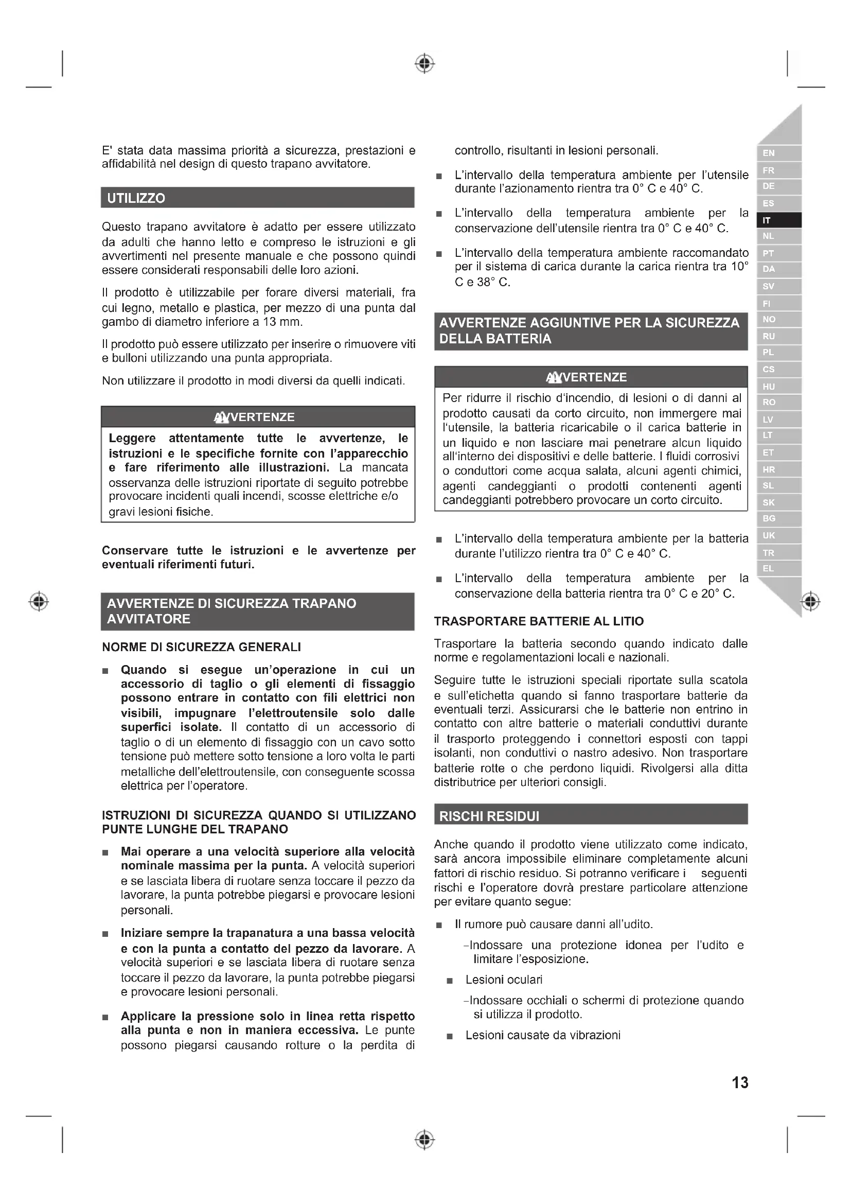 E' stata data massima priorità a sicurezza, prestazioni e DI¿GDELOLWjQHOGHVLJQGLTXHVWRWUDSDQRDYYLWDWRUH UTILIZZO Questo trapano avvitatore è adatto per essere utilizzato da adulti che hanno letto e compreso le istruzioni e gli avvertimenti nel presente manuale e che possono quindi essere considerati responsabili delle loro azioni. Il prodotto è utilizzabile per forare diversi materiali, fra cui legno, metallo e plastica, per mezzo di una punta dal gambo di diametro inferiore a 13 mm. Il prodotto può essere utilizzato per inserire o rimuovere viti e bulloni utilizzando una punta appropriata. Non utilizzare il prodotto in modi diversi da quelli indicati. AVVERTENZE Leggere attentamente tutte le avvertenze, le istruzioni e le specifiche fornite con l’apparecchio e fare riferimento alle illustrazioni. La mancata osservanza delle istruzioni riportate di seguito potrebbe SURYRFDUHLQFLGHQWLTXDOLLQFHQGLVFRVVHHOHWWULFKHHR JUDYLOHVLRQL¿VLFKH Conservare tutte le istruzioni e le avvertenze per eventuali riferimenti futuri.