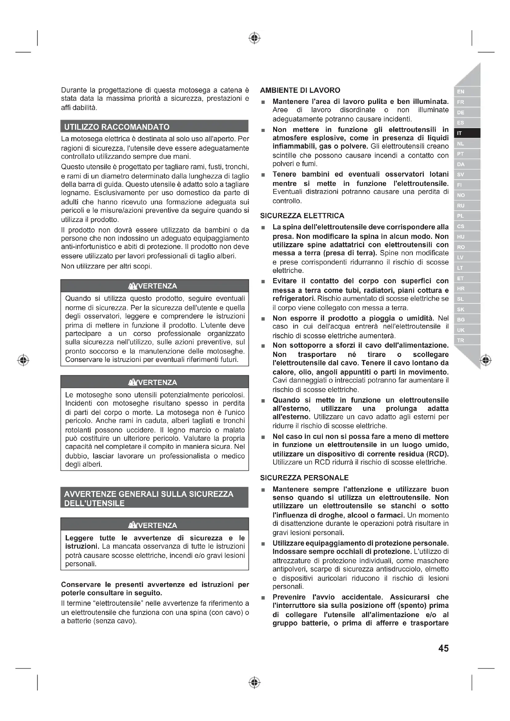 Durante la progettazione di questa motosega a catena è stata data la massima priorità a sicurezza, prestazioni e affi dabilità. UTILIZZO RACCOMANDATO La motosega elettrica è destinata al solo uso all'aperto. Per ragioni di sicurezza, l'utensile deve essere adeguatamente controllato utilizzando sempre due mani. Questo utensile è progettato per tagliare rami, fusti, tronchi, e rami di un diametro determinato dalla lunghezza di taglio della barra di guida. Questo utensile è adatto solo a tagliare legname. Esclusivamente per uso domestico da parte di adulti che hanno ricevuto una formazione adeguata sui pericoli e le misure/azioni preventive da seguire quando si utilizza il prodotto. Il prodotto non dovrà essere utilizzato da bambini o da persone che non indossino un adeguato equipaggiamento anti-infortunistico e abiti di protezione. Il prodotto non deve essere utilizzato per lavori professionali di taglio alberi. Non utilizzare per altri scopi. AVVERTENZA Quando si utilizza questo prodotto, seguire eventuali norme di sicurezza. Per la sicurezza dell'utente e quella degli osservatori, leggere e comprendere le istruzioni prima di mettere in funzione il prodotto. L'utente deve partecipare a un corso professionale organizzato sulla sicurezza nell'utilizzo, sulle azioni preventive, sul pronto soccorso e la manutenzione delle motoseghe. Conservare le istruzioni per eventuali riferimenti futuri. AVVERTENZA Le motoseghe sono utensili potenzialmente pericolosi. Incidenti con motoseghe risultano spesso in perdita di parti del corpo o morte. La motosega non è l'unico pericolo. Anche rami in caduta, alberi tagliati e tronchi rotolanti possono uccidere. Il legno marcio o malato può costituire un ulteriore pericolo. Valutare la propria capacità nel completare il compito in maniera sicura. Nel dubbio, lasciar lavorare un professionalista o medico degli alberi.