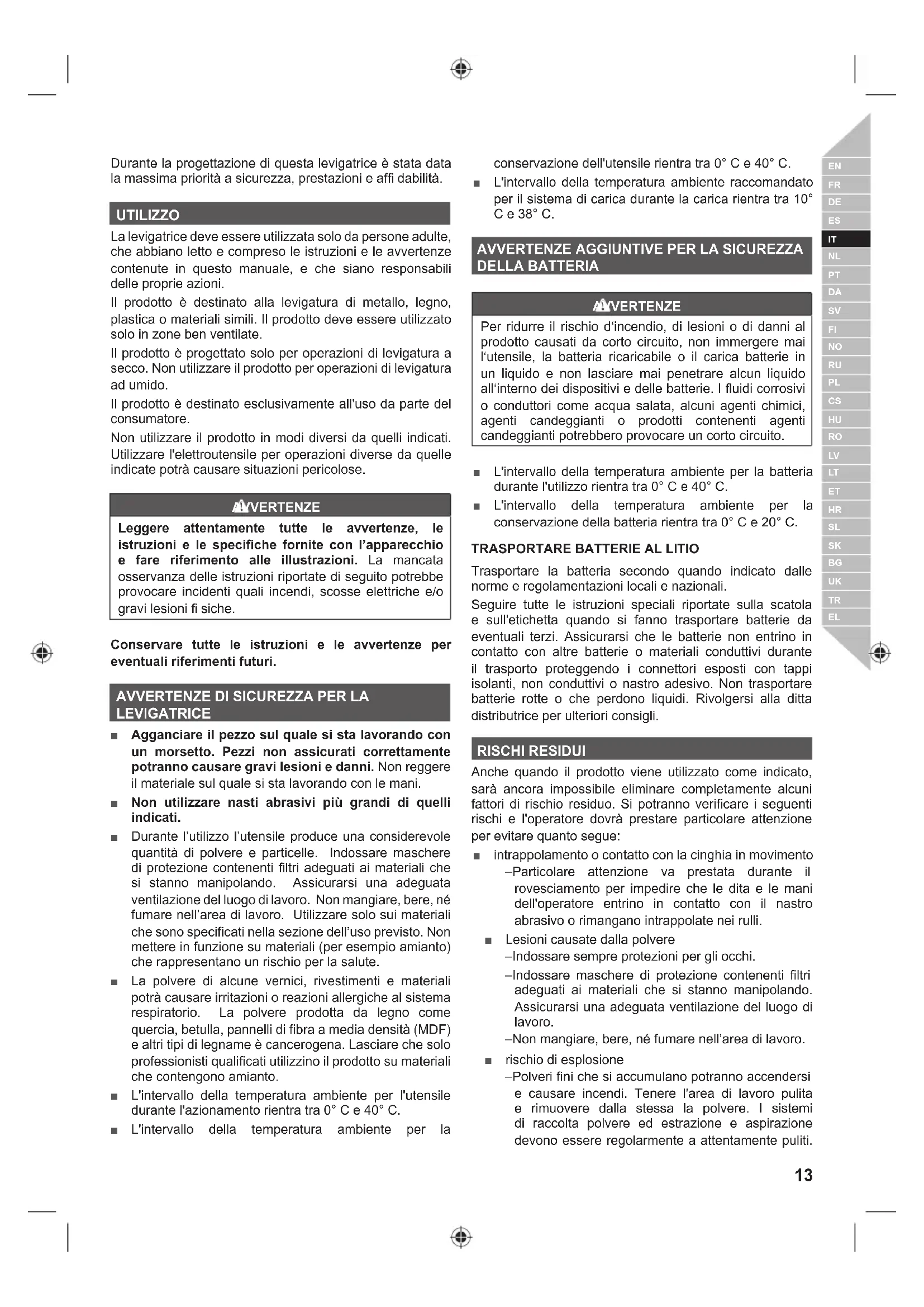 Trasportare la batteria secondo quando indicato dalle norme e regolamentazioni locali e nazionali. Seguire tutte le istruzioni speciali riportate sulla scatola e sull'etichetta quando si fanno trasportare batterie da eventuali terzi. Assicurarsi che le batterie non entrino in contatto con altre batterie o materiali conduttivi durante il trasporto proteggendo i connettori esposti con tappi isolanti, non conduttivi o nastro adesivo. Non trasportare batterie rotte o che perdono liquidi. Rivolgersi alla ditta distributrice per ulteriori consigli. RISCHI RESIDUI Anche quando il prodotto viene utilizzato come indicato, sarà ancora impossibile eliminare completamente alcuni fattori di rischio residuo. Si potranno verifi care i seguenti rischi e l'operatore dovrà prestare particolare attenzione per evitare quanto segue: ■ intrappolamento o contatto con la cinghia in movimento – Particolare attenzione va prestata durante il rovesciamento per impedire che le dita e le mani dell'operatore entrino in contatto con il nastro abrasivo o rimangano intrappolate nei rulli. ■ Lesioni causate dalla polvere – Indossare sempre protezioni per gli occhi. – Indossare maschere di protezione contenenti filtri adeguati ai materiali che si stanno manipolando. Assicurarsi una adeguata ventilazione del luogo di lavoro. – Non mangiare, bere, né fumare nell’area di lavoro. ■ rischio di esplosione – Polveri fini che si accumulano potranno accendersi e causare incendi. Tenere l'area di lavoro pulita e rimuovere dalla stessa la polvere. I sistemi di raccolta polvere ed estrazione e aspirazione devono essere regolarmente a attentamente puliti.14 | Italiano Quando si levigano metalli, si potranno produrre scintille calde. ■ rumore e vibrazioni – Indossare cuffie di protezione quando si mette in funzione il prodotto. Non mettere in funzione il prodotto per lunghi periodi di tempo.