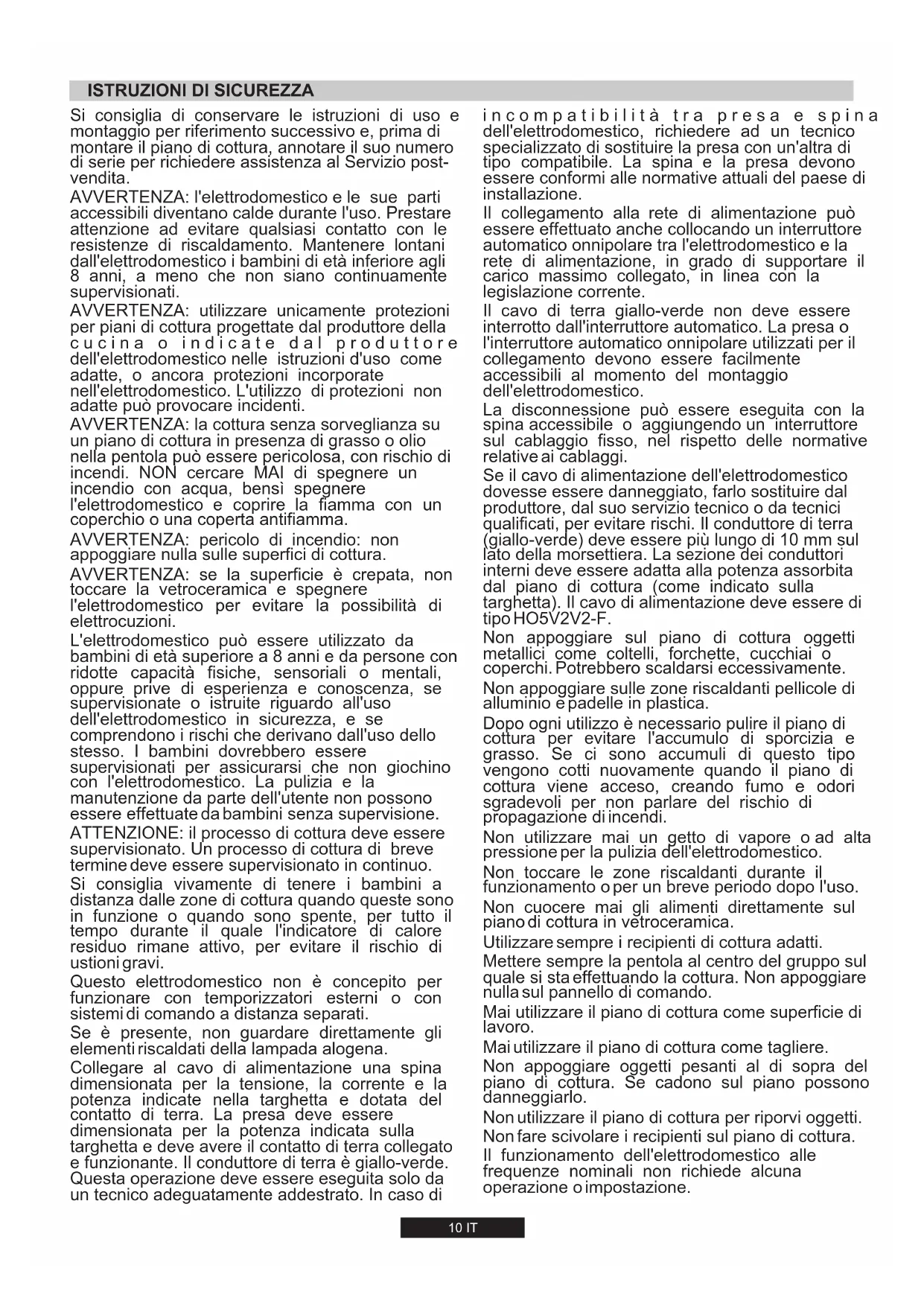 Avant de nettoyer la table de cuisson, assurez-vous que cet appareil est refroidi. Retirez la fiche de la prise ou (s'il est connecté directement), éteindre l'alimentation d'électricité. Le nettoyage et l'entretien par l'utilisateur ne doit pas être fait par des enfants sans surveillance. Ne jamais utiliser de produits abrasifs, de détergents corrosifs, agents de blanchiment ou d'acides. Éviter les substances acides ou alcalines (citron, jus, vinaigre etc…) sur l'émail ou l'acier. Lors du nettoyage de l'émail, vernis ou des sections chromées, utilisez de l'eau chaude savonneuse ou un détergent non corrosif. Pour l'acier inoxydable, utilisez une solution de nettoyage appropriée. Les brûleurs peuvent être nettoyés avec de l'eau savonneuse. Pour restaurer leur éclat d'origine, utilisez un nettoyant ménager pour acier inoxydable. Après nettoyage, séchez les brûleurs et les replacer. Il est important que les brûleurs soient remplacés correctement à leur position. Grilles chromées et brûleurs Les grilles chromées et les brûleurs ont tendance à foncer à l'utilisation. Il s'agit d'un phénomène normal et inévitable, mais elle ne compromet pas la fonctionnalité de la table de cuisson. Si besoin, des pièces de rechange sont disponibles dans notre centre de service après-vente.10 IT Si consiglia di conservare le istruzioni di uso e montaggio per riferimento successivo e, prima di montare il piano di cottura, annotare il suo numero di serie per richiedere assistenza al Servizio post- vendita. AVVERTENZA: l'elettrodomestico e le sue parti accessibili diventano calde durante l'uso. Prestare attenzione ad evitare qualsiasi contatto con le resistenze di riscaldamento. Mantenere lontani dall'elettrodomestico i bambini di età inferiore agli 8 anni, a meno che non siano continuamente supervisionati. AVVERTENZA: utilizzare unicamente protezioni per piani di cottura progettate dal produttore della c u c i n a o i n d i c a t e d a l p r o d u t t o r e dell'elettrodomestico nelle istruzioni d'uso come adatte, o ancora protezioni incorporate nell'elettrodomestico. L'utilizzo di protezioni non adatte può provocare incidenti. AVVERTENZA: la cottura senza sorveglianza su un piano di cottura in presenza di grasso o olio nella pentola può essere pericolosa, con rischio di incendi. NON cercare MAI di spegnere un incendio con acqua, bensì spegnere l'elettrodomestico e coprire la fiamma con un coperchio o una coperta antifiamma. AVVERTENZA: pericolo di incendio: non appoggiare nulla sulle superfici di cottura. AVVERTENZA: se la superficie è crepata, non toccare la vetroceramica e spegnere l'elettrodomestico per evitare la possibilità di elettrocuzioni. L'elettrodomestico può essere utilizzato da bambini di età superiore a 8 anni e da persone con ridotte capacità fisiche, sensoriali o mentali, oppure prive di esperienza e conoscenza, se supervisionate o istruite riguardo all'uso dell'elettrodomestico in sicurezza, e se comprendono i rischi che derivano dall'uso dello stesso. I bambini dovrebbero essere supervisionati per assicurarsi che non giochino con l'elettrodomestico. La pulizia e la manutenzione da parte dell'utente non possono essere effettuate da bambini senza supervisione. ATTENZIONE: il processo di cottura deve essere supervisionato. Un processo di cottura di breve termine deve essere supervisionato in continuo. Si consiglia vivamente di tenere i bambini a distanza dalle zone di cottura quando queste sono in funzione o quando sono spente, per tutto il tempo durante il quale l'indicatore di calore residuo rimane attivo, per evitare il rischio di ustioni gravi. Questo elettrodomestico non è concepito per funzionare con temporizzatori esterni o con sistemi di comando a distanza separati. Se è presente, non guardare direttamente gli elementi riscaldati della lampada alogena. Collegare al cavo di alimentazione una spina dimensionata per la tensione, la corrente e la potenza indicate nella targhetta e dotata del contatto di terra. La presa deve essere dimensionata per la potenza indicata sulla targhetta e deve avere il contatto di terra collegato e funzionante. Il conduttore di terra è giallo-verde. Questa operazione deve essere eseguita solo da un tecnico adeguatamente addestrato. In caso di