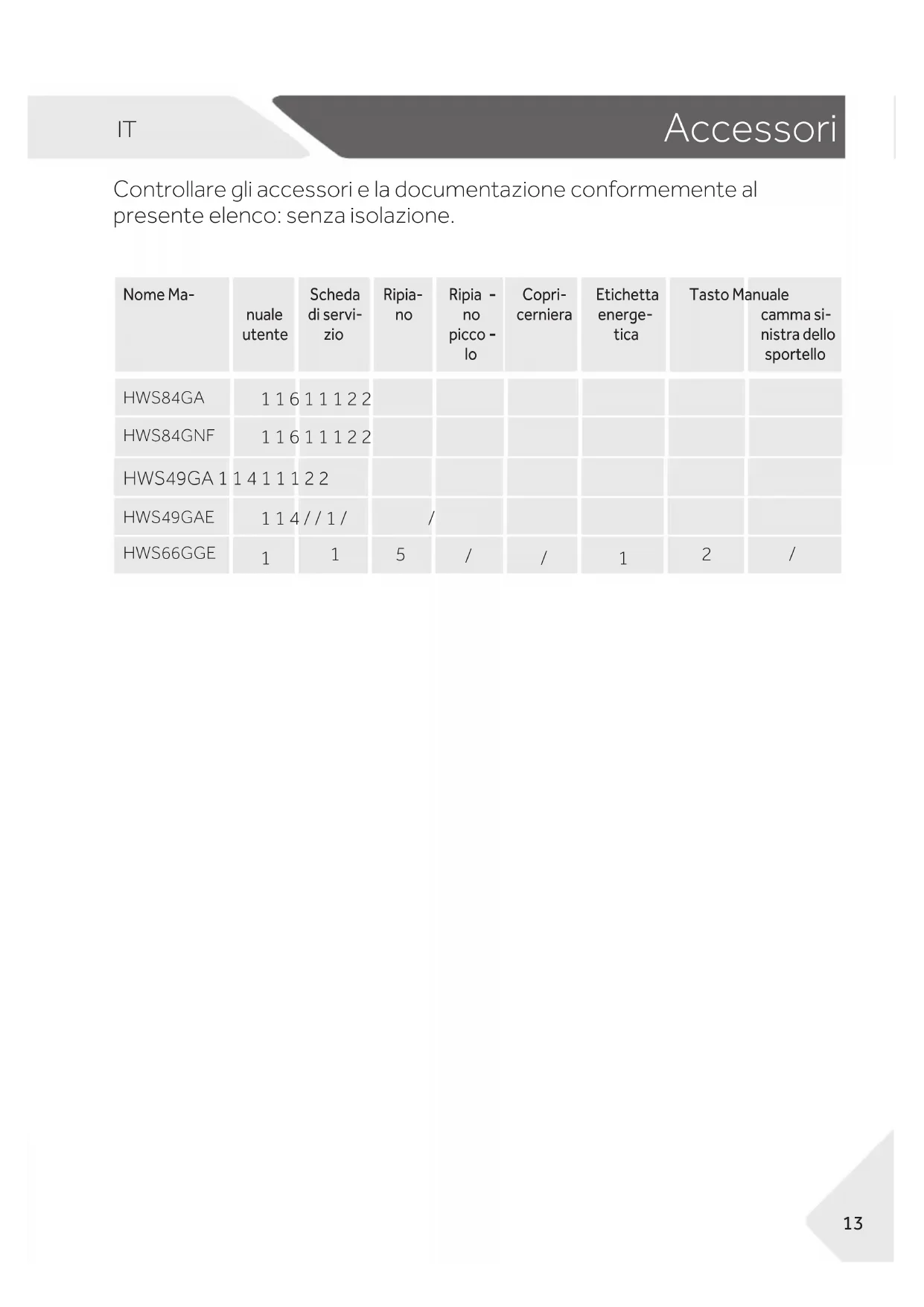 | Nome modello/identificativo | HWS49GA/HWS49GAE | HWS84GNF | HWS84GA/HWS66GGE |
