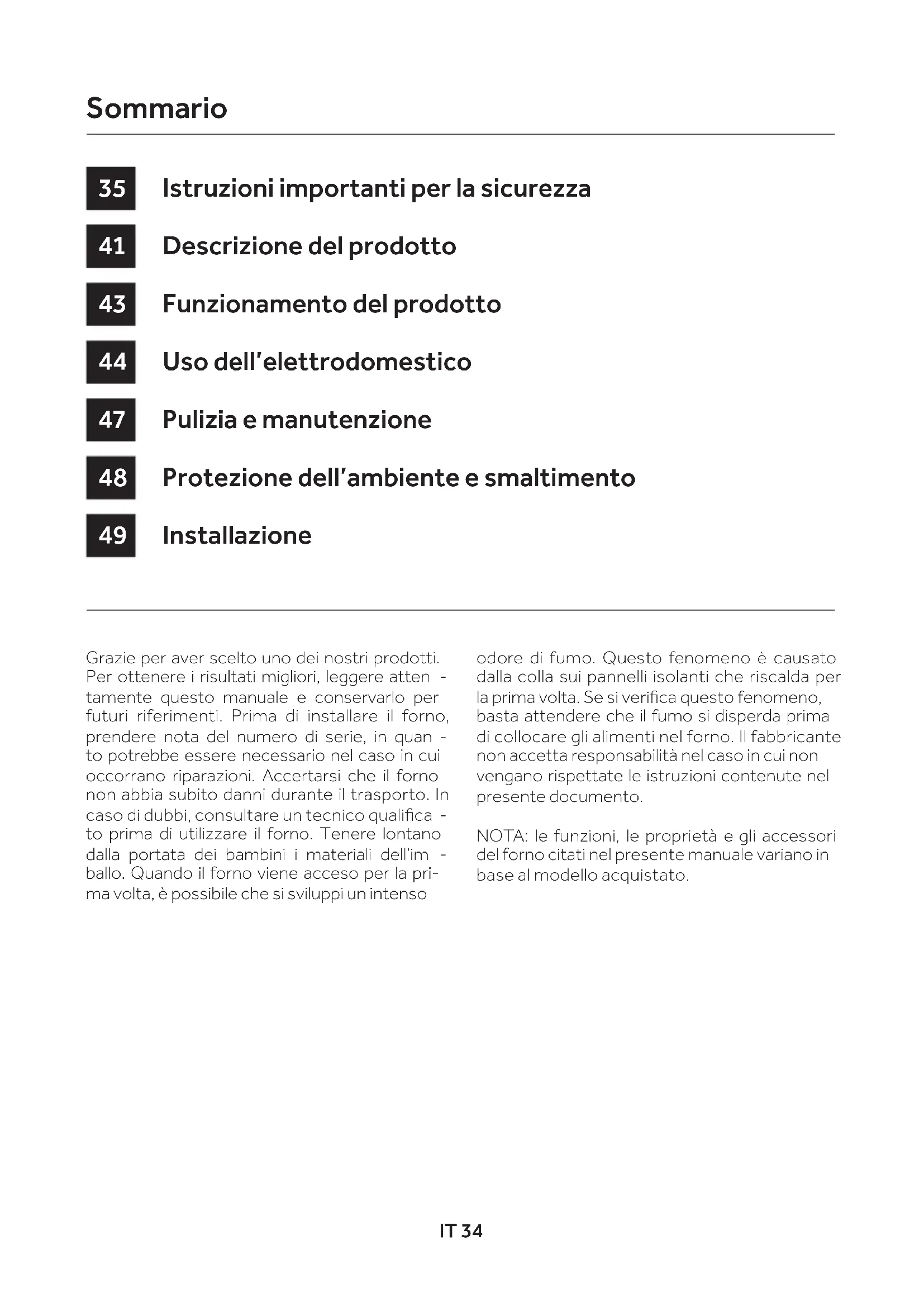 ballo. Quando il forno viene acceso per la pri- ma volta, è possibile che si sviluppi un intenso odore di fumo. Questo fenomeno è causato dalla colla sui pannelli isolanti che riscalda per la prima volta. Se si verica questo fenomeno, basta attendere che il fumo si disperda prima di collocare gli alimenti nel forno. Il fabbricante non accetta responsabilità nel caso in cui non vengano rispettate le istruzioni contenute nel presente documento. NOTA: le funzioni, le proprietà e gli accessori del forno citati nel presente manuale variano in base al modello acquistato. Istruzioni importanti per la sicurezza Descrizione del prodotto Funzionamento del prodotto Uso dell’elettrodomestico Pulizia e manutenzione Protezione dell’ambiente e smaltimento Installazione
