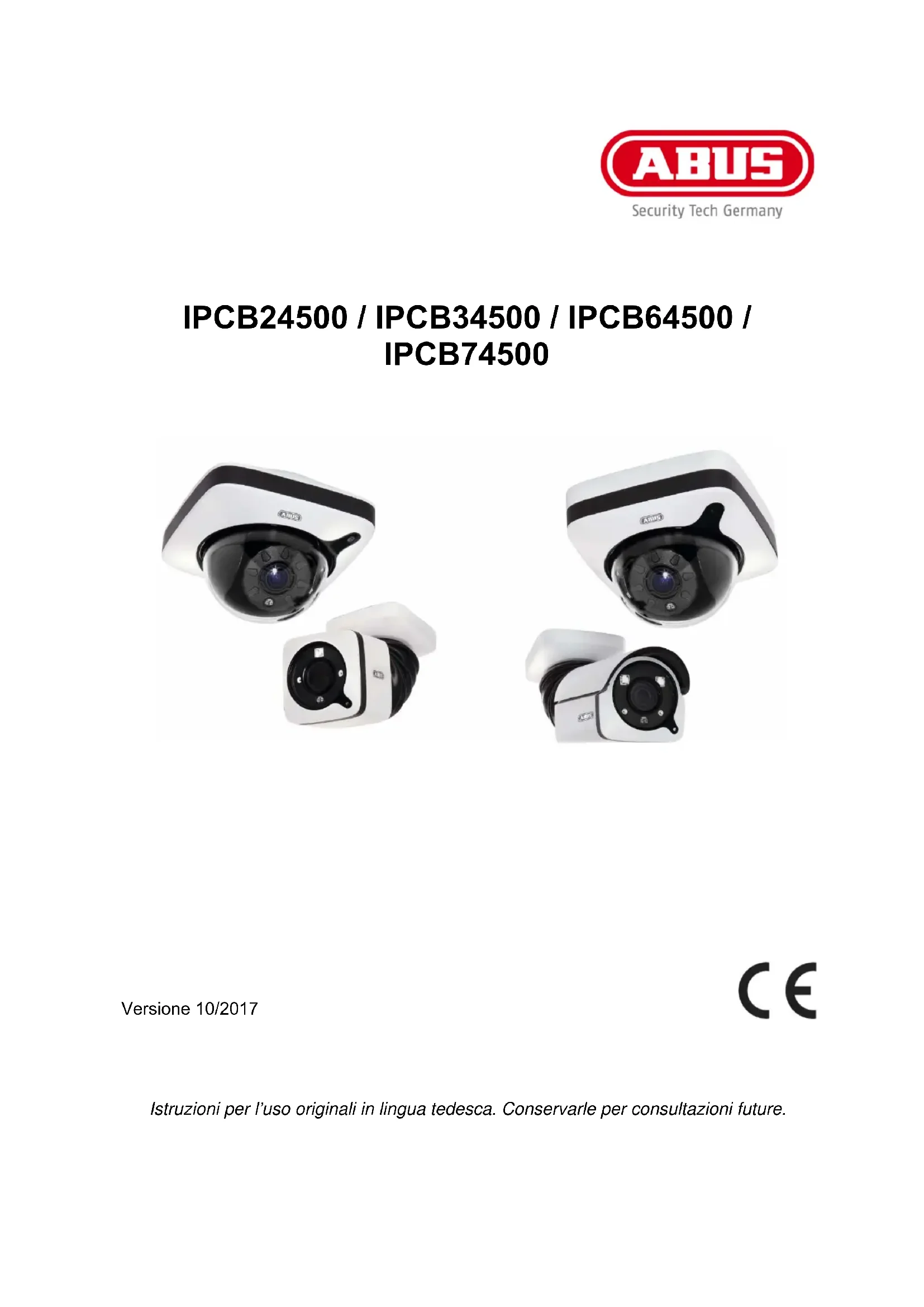 Gentile cliente, La ringraziamo per aver acquistato questo prodotto. IPCB24500 Questo dispositivo risponde ai requisiti previsti dalle seguenti direttive europee: direttiva sulla compatibilità elettromagnetica EMC 2014/30/UE e direttiva RoHS 2011/65/UE. Il testo completo della dichiarazione di conformità UE è disponibile al seguente indirizzo Internet: www.abus.com/product/IPCB24500 IPCB34500 Questo dispositivo risponde ai requisiti previsti dalle seguenti direttive europee: direttiva sulla compatibilità elettromagnetica EMC 2014/30/UE e direttiva RoHS 2011/65/UE. Il testo completo della dichiarazione di conformità UE è disponibile al seguente indirizzo Internet: www.abus.com/product/IPCB34500 IPCB64500 Questo dispositivo risponde ai requisiti previsti dalle seguenti direttive europee: direttiva sulla compatibilità elettromagnetica EMC 2014/30/UE e direttiva RoHS 2011/65/UE. Il testo completo della dichiarazione di conformità UE è disponibile al seguente indirizzo Internet: www.abus.com/product/IPCB64500 IPCB74500 Questo dispositivo risponde ai requisiti previsti dalle seguenti direttive europee: direttiva sulla compatibilità elettromagnetica EMC 2014/30/UE e direttiva RoHS 2011/65/UE. Il testo completo della dichiarazione di conformità UE è disponibile al seguente indirizzo Internet: www.abus.com/product/IPCB74500 Al fine di preservare tale stato e garantire un funzionamento sicuro, l'utente è tenuto a osservare le presenti istruzioni per l'uso. Prima di mettere in funzione il prodotto, leggere tutte le istruzioni per l’uso, facendo attenzione alle avvertenze sull’uso e sulla sicurezza.