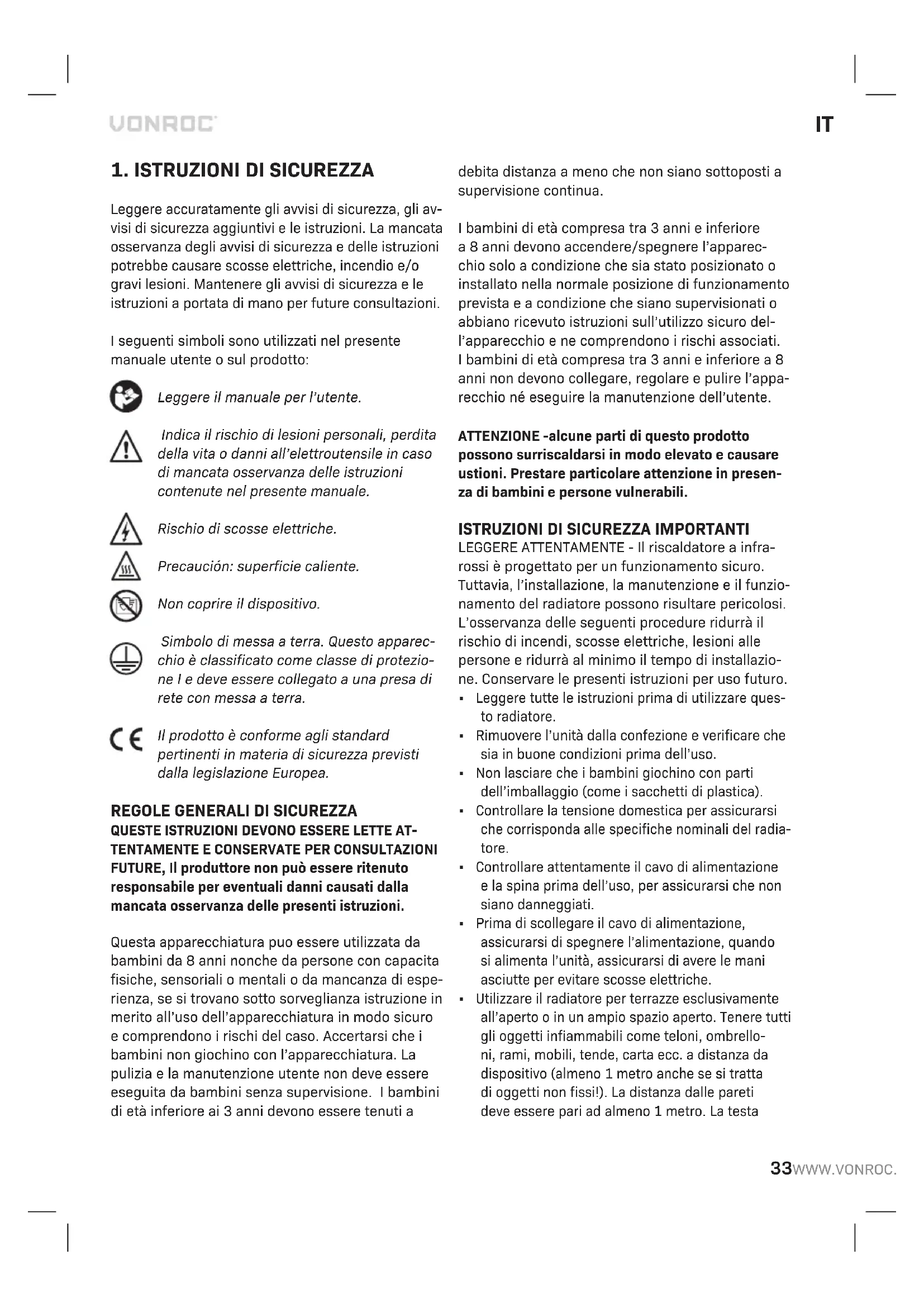 LEGGERE ATTENTAMENTE - Il riscaldatore a infra- rossi è progettato per un funzionamento sicuro. Tuttavia, l’installazione, la manutenzione e il funzio- namento del radiatore possono risultare pericolosi. L’osservanza delle seguenti procedure ridurrà il rischio di incendi, scosse elettriche, lesioni alle persone e ridurrà al minimo il tempo di installazio- ne. Conservare le presenti istruzioni per uso futuro.