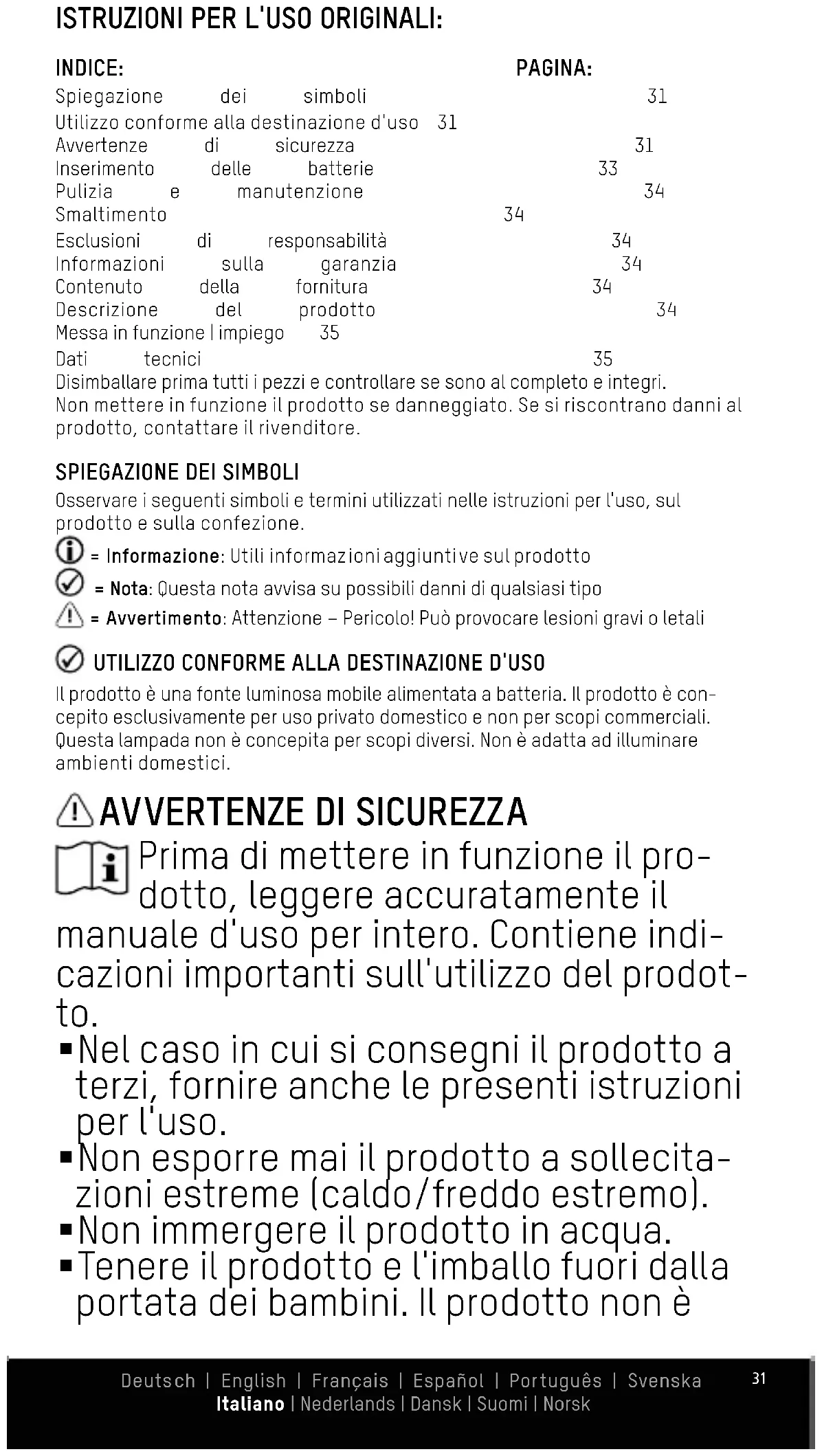 1 COB-LED 2 Interruttore 3 Vano batteria35 USO La lampada si accende e si spegne tramite l'apposito interruttore. DATI TECNICI Lampadine: COB-LED Gruppo di rischio: 2 Alimentazione elettrica: 3 batterie alcaline Micro AAA LR03 (comprese nella fornitura) Classe di protezione: III Flusso luminoso: 175lm Autonomia: 6h Distanza di illumina- zione: 19m Materiale alloggia- mento: alluminio Tipo di protezione: IPX3 Temperatura di stoc- caggio: da -10 a 50 °C Temperatura di esercizio: da -10 a 25 °C Peso: 42,5g (senza batterie) Dimensioni: 95 × 29 × 29mm Il prodotto è conforme ai requisiti della direttiva UE. Con riserva di modifiche tecniche. Non ci assumiamo nessuna responsabilità per eventuali errori di stampa. Deutsch | English | Français | Español | Português | Svenska Italiano | Nederlands | Dansk | Suomi | Norsk36