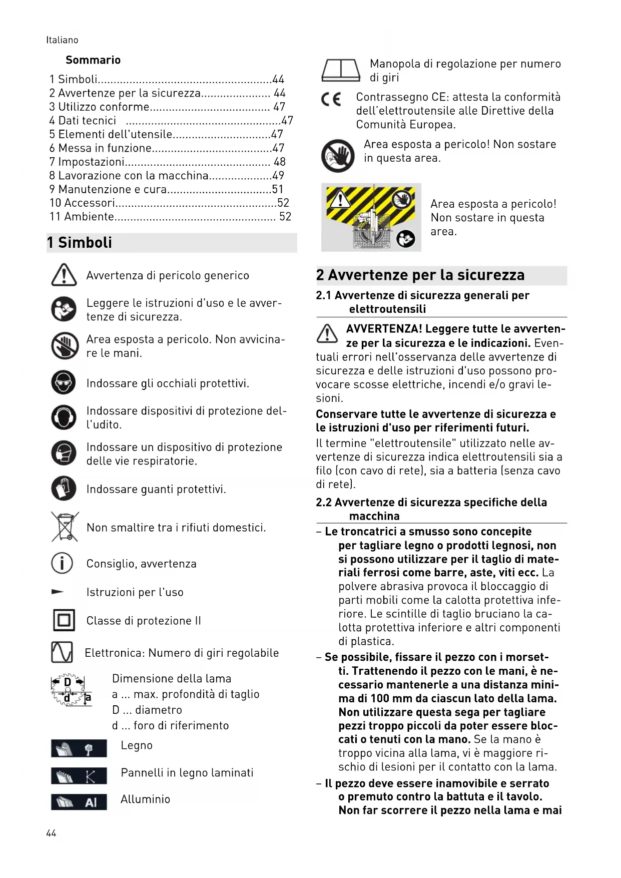 Dimensione della lama a ... max. profondità di taglio D ... diametro d ... foro di riferimento Legno Pannelli in legno laminati Alluminio Manopola di regolazione per numero di giri Contrassegno CE: attesta la conformità dell’elettroutensile alle Direttive della Comunità Europea. Area esposta a pericolo! Non sostare in questa area. Area esposta a pericolo! Non sostare in questa area. 2 Avvertenze per la sicurezza
