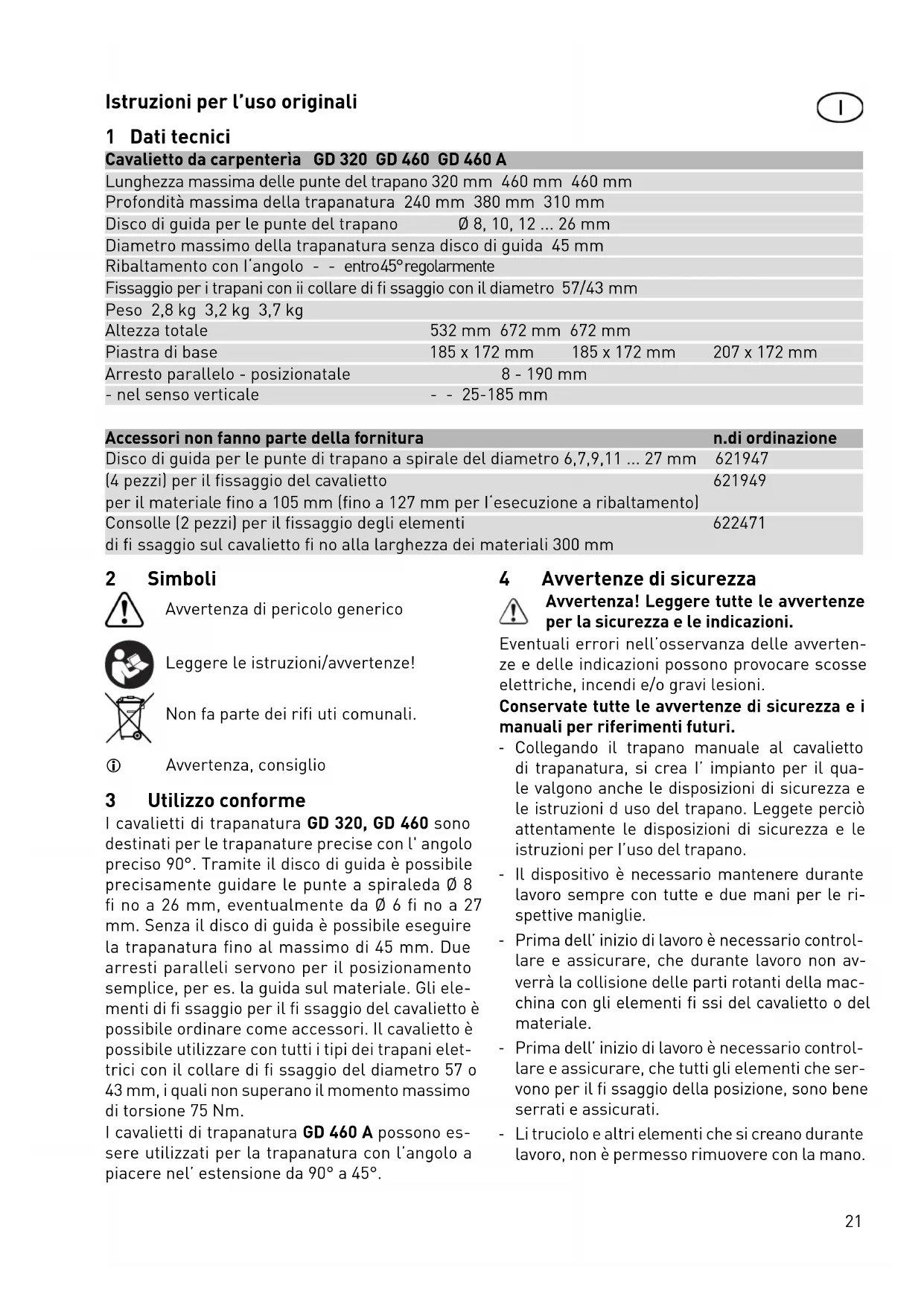 Utilice únicamente piezas de recambio Festool originales. Referencia en: www.festool.com/service - Limpien las piezas fi jadoras y las zonas de su- jeción del polvo, impurezas y virutas. - Limpien con paño las varillas de guía de las im- purezas. Con aplicación de grasa lubricante o de aceite para máquinas sobre varillas de guía aseguren buenas propiedades de deslizamien- to. - Mantengan limpias las superfi cies de apoyo de la base, porque con eso asegurarán la preci- sión y exactitud de los ángulos. Respeten lo siguiente: - Los muelles seleccionados del soporte de ta- ladrar tienen con plena conciencia una mayor separación de las varillas de guía. Esto no es una imperfección de calidad, al contrario, con eso se alcanza una mejor característica de los muelles. Estos muelles aseguran menor re- sistencia durante el taladrado. 9 Medio ambiente ¡No desechar con la basura doméstica! Recicle las herramientas, accesorios y embalajes de for- ma respetuosa con el medio ambiente. Respete las disposiciones nacionales vigentes. Información sobre REACh: www.festool.com/reach21 Istruzioni per l’uso originali 1 Dati tecnici Cavalietto da carpenterìa GD 320 GD 460 GD 460 A Lunghezza massima delle punte del trapano 320 mm 460 mm 460 mm Profondità massima della trapanatura 240 mm 380 mm 310 mm Disco di guida per le punte del trapano Ø 8, 10, 12 ... 26 mm Diametro massimo della trapanatura senza disco di guida 45 mm Ribaltamento con I‘angolo - - entro 45° regolarmente Fissaggio per i trapani con ii collare di fi ssaggio con il diametro 57/43 mm Peso 2,8 kg 3,2 kg 3,7 kg Altezza totale 532 mm 672 mm 672 mm Piastra di base 185 x 172 mm 185 x 172 mm 207 x 172 mm Arresto parallelo - posizionatale 8 - 190 mm - nel senso verticale - - 25-185 mm Accessori non fanno parte della fornitura n.di ordinazione Disco di guida per le punte di trapano a spirale del diametro 6,7,9,11 ... 27 mm 621947 (4 pezzi) per il fi ssaggio del cavalietto 621949 per il materiale fi no a 105 mm (fi no a 127 mm per I‘esecuzione a ribaltamento) Consolle (2 pezzi) per il fi ssaggio degli elementi 622471 di fi ssaggio sul cavalietto fi no alla larghezza dei materiali 300 mm 2 Simboli Avvertenza di pericolo generico Leggere le istruzioni/avvertenze! Non fa parte dei rifi uti comunali. Avvertenza, consiglio 3 Utilizzo conforme I cavalietti di trapanatura GD 320, GD 460 sono destinati per le trapanature precise con l' angolo preciso 90°. Tramite il disco di guida è possibile precisamente guidare le punte a spiraleda Ø 8 fi no a 26 mm, eventualmente da Ø 6 fi no a 27 mm. Senza il disco di guida è possibile eseguire la trapanatura fi no al massimo di 45 mm. Due arresti paralleli servono per il posizionamento semplice, per es. la guida sul materiale. Gli ele- menti di fi ssaggio per il fi ssaggio del cavalietto è possibile ordinare come accessori. Il cavalietto è possibile utilizzare con tutti i tipi dei trapani elet- trici con il collare di fi ssaggio del diametro 57 o 43 mm, i quali non superano il momento massimo di torsione 75 Nm. I cavalietti di trapanatura GD 460 A possono es- sere utilizzati per la trapanatura con l’angolo a piacere nel’ estensione da 90° a 45°. 4 Avvertenze di sicurezza Avvertenza! Leggere tutte le avvertenze per la sicurezza e le indicazioni. Eventuali errori nell’osservanza delle avverten- ze e delle indicazioni possono provocare scosse elettriche, incendi e/o gravi lesioni. Conservate tutte le avvertenze di sicurezza e i manuali per riferimenti futuri. - Collegando il trapano manuale al cavalietto di trapanatura, si crea I’ impianto per il qua- le valgono anche le disposizioni di sicurezza e le istruzioni d uso del trapano. Leggete perciò attentamente le disposizioni di sicurezza e le istruzioni per I’uso del trapano. - Il dispositivo è necessario mantenere durante lavoro sempre con tutte e due mani per le ri- spettive maniglie. - Prima dell’ inizio di lavoro è necessario control- lare e assicurare, che durante lavoro non av- verrà la collisione delle parti rotanti della mac- china con gli elementi fi ssi del cavalietto o del materiale. - Prima dell’ inizio di lavoro è necessario control- lare e assicurare, che tutti gli elementi che ser- vono per il fi ssaggio della posizione, sono bene serrati e assicurati. - Li truciolo e altri elementi che si creano durante lavoro, non è permesso rimuovere con la mano.22 - Per i trapani con il momento di torsione più alto di 55 Nm è necessario utilizzare sempre con la maniglia supplementare anche la prolunga. - Il materiale è necessario sostenere sempre con un appoggio solido e assicurarlo contro il gira- mento parziale e contro lo slittamento. - Cavalietti di trapanatura ribaltabili (GD 460 A) è necessario assicurare durante la trapanatura controlo spostamento. A questo scopo consi- gliamo di utilizzare i morsetti (accessori) . - Durante lavoro mantenete la posizione sicura e fi ssa. - Durante tutti i lavori che servono per la prepa- razione, montaggio, regolazione, sostituzione delle punte, manutenzione e pulizia è necessa- rio scollegare la spina del trapano dalla rete d alimentazione. 5 Elementi dell'utensile 1 Lastra di base 2 Guida parallela 3 Disco di guida per le punte del trapano 4 Barre di guida 5 Molle 6 Tubo d arresto 7 Arresti di profondità 8 Bussola di guida 9 Riduzione D 57/43 mm 10 Maniglia aggiuntiva 11 Prolunga della maniglia aggiuntiva 12 Morsetti 13 Consolle 14 Vite per regolazione della verticale 15 Scala 16 Dadi di fi ssaggio 17 Scala 18 Indicatore 19 Vite di fi ssaggio dell’ indicatore 20 Staffa Tutti gli accessori illustrati e descritti non fanno parte della fornitura. Le fi gure indicate nel testo si trovano all’inizio delle istruzioni per l’uso. 6 Messa in esercizio ed uso