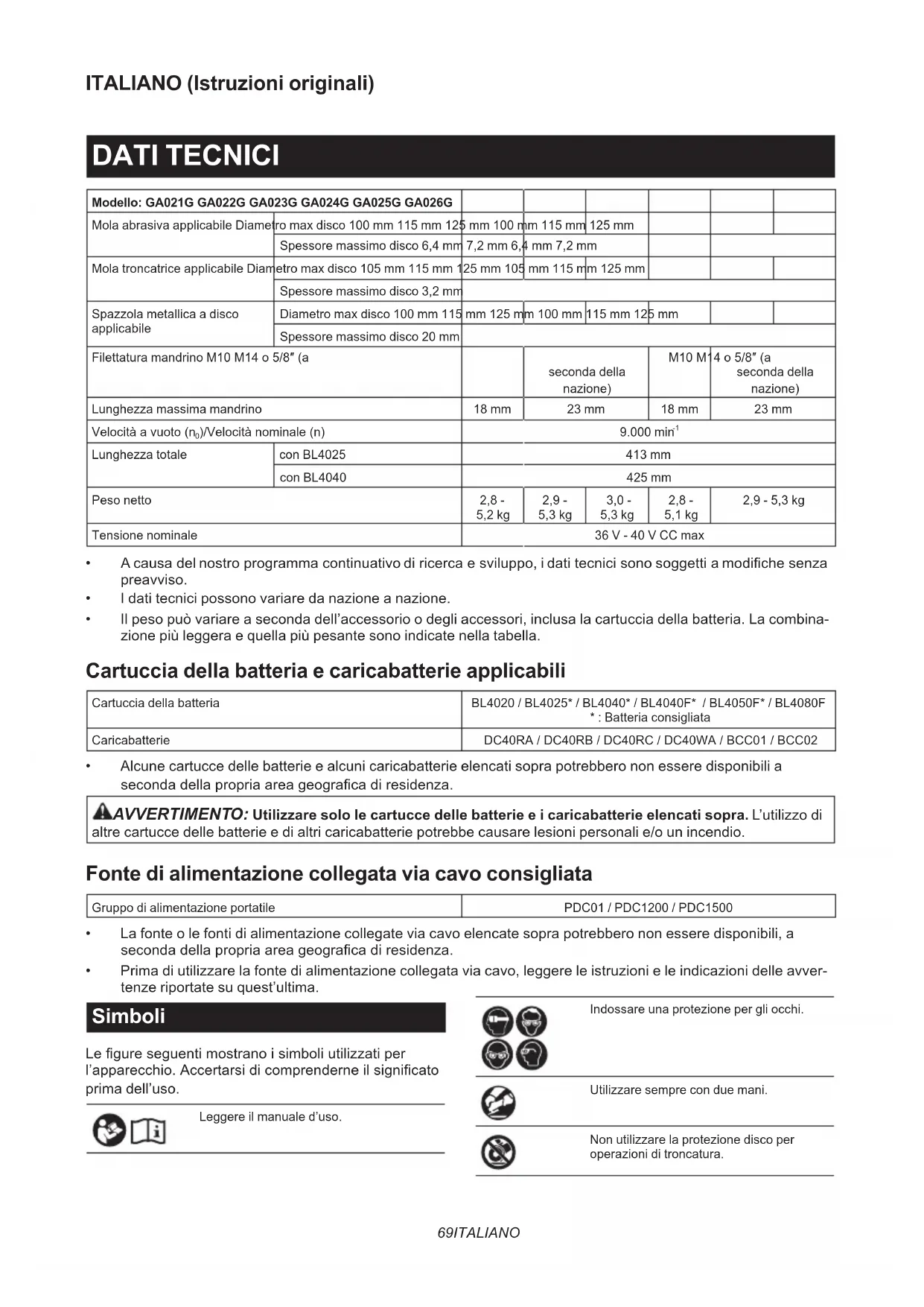 o inferiore 1,5 GA026G 3,0 1,5 NOTA: Il valore o i valori complessivi delle vibrazioni dichiarati sono stati misurati in conformità a un metodo stan- dard di verica, e possono essere utilizzati per confrontare un utensile con un altro. NOTA: Il valore o i valori complessivi delle vibrazioni dichiarati possono venire utilizzati anche per una valutazione preliminare dell’esposizione. AVVERTIMENTO: L’emissione delle vibrazioni durante l’utilizzo eettivo dell’utensile elettrico può variare rispetto al valore o ai valori dichiarati, a seconda dei modi in cui viene utilizzato l’utensile, special- mente a seconda di che tipo di pezzo venga lavorato. AVVERTIMENTO: Accertarsi di identicare misure di sicurezza per la protezione dell’operatore che siano basate su una stima dell’esposizione nelle condizioni eettive di utilizzo (tenendo conto di tutte le parti del ciclo operativo, ad esempio del numero di spegnimenti dell’utensile e di quando giri a vuoto, oltre al tempo di attivazione). AVVERTIMENTO: Il valore di emissione delle vibrazioni dichiarato viene utilizzato per le applicazioni prin- cipali dell’utensile elettrico. Tuttavia, qualora l’utensile elettrico venga utilizzato per altre applicazioni, il valore di emissione delle vibrazioni potrebbe essere diverso. Dichiarazioni di conformità Solo per i paesi europei Le Dichiarazioni di conformità sono incluse nell’Allegato A al presente manuale d’uso.72 ITALIANO AVVERTENZE DI SICUREZZA Avvertenze generali relative alla sicurezza dell’utensile elettrico AVVERTIMENTO Leggere tutte le avvertenze di sicurezza, le istruzioni, le illustrazioni e i dati tecnici forniti insieme a questo utensile elettrico. La man- cata osservanza di tutte le istruzioni seguenti potrebbe risultare in scosse elettriche, incendi e/o gravi lesioni personali. Conservare tutte le avvertenze e le istruzioni come riferimento futuro. Il termine “utensile elettrico” nelle avvertenze si riferisce sia all’utensile elettrico (cablato) nel funzionamento alimentato da rete elettrica che all’utensile elettrico (a batteria) nel funzionamento alimentato a batteria. Avvertenze di sicurezza relative alla smerigliatrice a batteria Avvertenze di sicurezza comuni relative alle opera- zioni di smerigliatura, carteggiatura, spazzolatura metallica o troncatura: