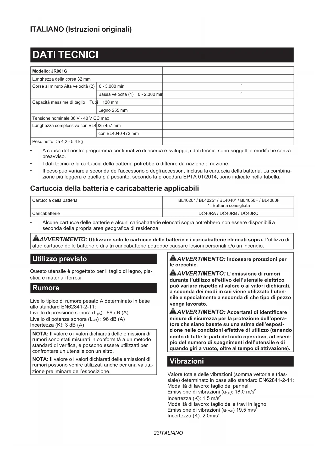 Incertezza(K):2,0m/s 224 ITALIANO NOTA:Ilvaloreoivaloricomplessividellevibra- zionidichiaratisonostatimisuratiinconformitàaun metodostandarddiverica,epossonoessereutiliz- zati per confrontare un utensile con un altro. NOTA:Ilvaloreoivaloricomplessividellevibrazioni dichiarati possono venire utilizzati anche per una valutazione preliminare dell’esposizione. AVVERTIMENTO: L’emissione delle vibra- zioni durante l’utilizzo eettivo dell’utensile elettrico può variare rispetto al valore o ai valori dichiarati, a seconda dei modi in cui viene utiliz- zato l’utensile, specialmente a seconda di che tipo di pezzo venga lavorato. AVVERTIMENTO: Accertarsi di identicare misure di sicurezza per la protezione dell’opera- tore che siano basate su una stima dell’esposi- zione nelle condizioni eettive di utilizzo (tenendo conto di tutte le parti del ciclo operativo, ad esem- pio del numero di spegnimenti dell’utensile e di quando giri a vuoto, oltre al tempo di attivazione). Dichiarazioni di conformità Solo per i paesi europei LeDichiarazionidiconformitàsonoinclusenell’Allegato Aalpresentemanualed’uso. AVVERTENZE DI SICUREZZA Avvertenze generali relative alla sicurezza dell’utensile elettrico AVVERTIMENTO Leggere tutte le avvertenze di sicurezza, le istruzioni, le illustrazioni e i dati tecnici forniti insieme a questo utensile elettrico. La mancata osservanzaditutteleistruzioniseguentipotrebberisultare inscosseelettriche,incendie/ogravilesionipersonali. Conservare tutte le avvertenze e le istruzioni come riferimento futuro. Iltermine“utensileelettrico”nelleavvertenzesiriferisce siaall’utensileelettrico(cablato)nelfunzionamento alimentato da rete elettrica che all’utensile elettrico (a batteria)nelfunzionamentoalimentatoabatteria. Avvertenze per la sicurezza del seghetto diritto a batteria