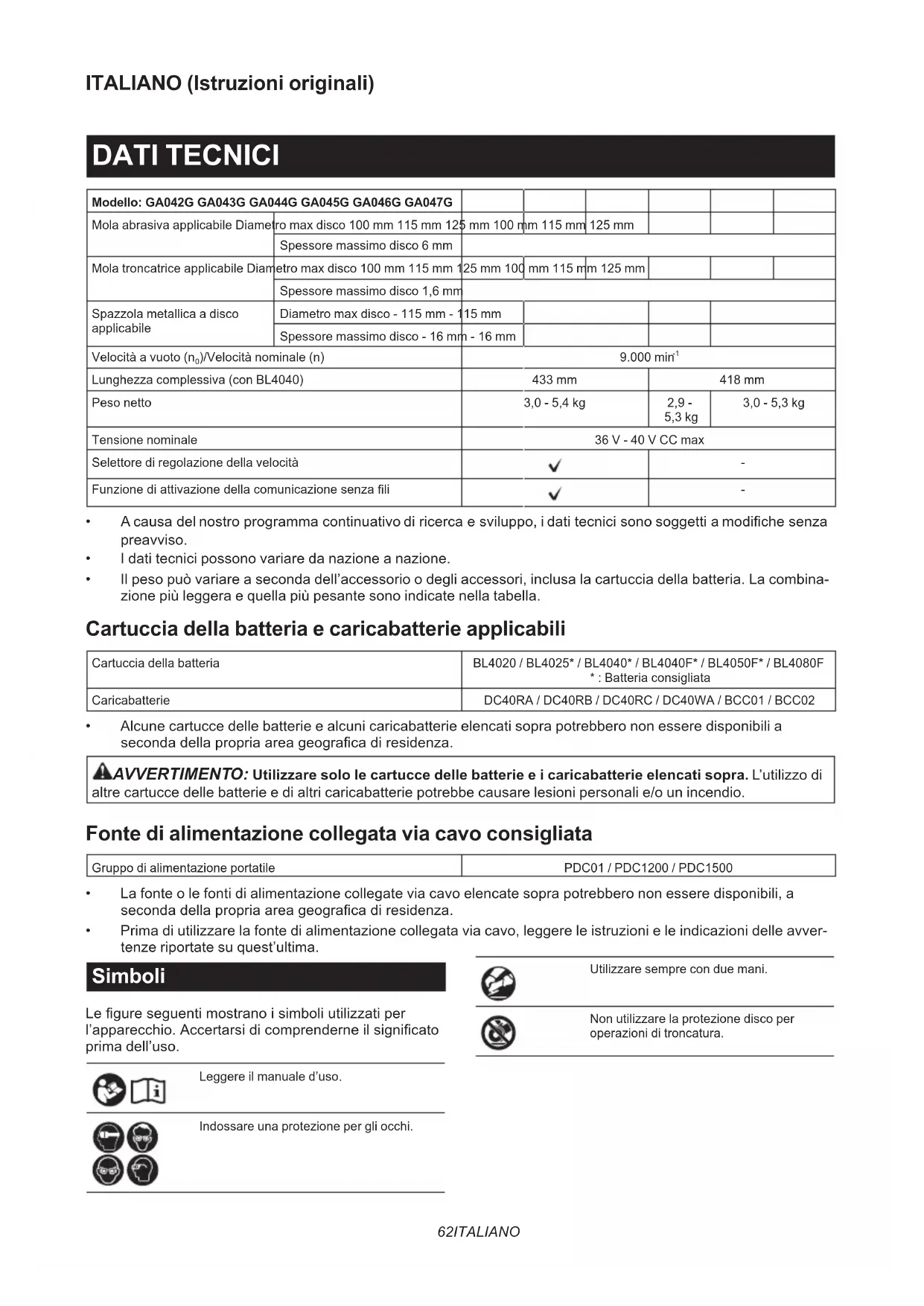 o inferiore 1,5 NOTA: Il valore o i valori complessivi delle vibrazioni dichiarati sono stati misurati in conformità a un metodo stan- dard di verica, e possono essere utilizzati per confrontare un utensile con un altro. NOTA: Il valore o i valori complessivi delle vibrazioni dichiarati possono venire utilizzati anche per una valutazione preliminare dell’esposizione. AVVERTIMENTO: L’emissione delle vibrazioni durante l’utilizzo eettivo dell’utensile elettrico può variare rispetto al valore o ai valori dichiarati, a seconda dei modi in cui viene utilizzato l’utensile, special- mente a seconda di che tipo di pezzo venga lavorato. AVVERTIMENTO: Accertarsi di identicare misure di sicurezza per la protezione dell’operatore che siano basate su una stima dell’esposizione nelle condizioni eettive di utilizzo (tenendo conto di tutte le parti del ciclo operativo, ad esempio del numero di spegnimenti dell’utensile e di quando giri a vuoto, oltre al tempo di attivazione). AVVERTIMENTO: Il valore di emissione delle vibrazioni dichiarato viene utilizzato per le applicazioni prin- cipali dell’utensile elettrico. Tuttavia, qualora l’utensile elettrico venga utilizzato per altre applicazioni, il valore di emissione delle vibrazioni potrebbe essere diverso. AVVERTIMENTO: La smerigliatura di lastre sottili di metallo o di altre strutture che vibrano facilmente con una grande supercie può risultare in un’emissione di rumore totale molto più elevata (no a 15 dB) rispetto ai valori delle emissioni di rumore dichiarati. Applicare tappetini di attenuazione pesanti essibili oppure oggetti simili su tali pezzi in lavorazione, per evitare che emettano rumore. Prendere in considerazione le emissioni di rumore aumentate sia per la valutazione del rischio di esposi- zione al rumore che per la scelta di protezioni per l’udito adeguate. Dichiarazioni di conformità Solo per i paesi europei Le Dichiarazioni di conformità sono incluse nell’Allegato A al presente manuale d’uso.65 ITALIANO AVVERTENZE DI SICUREZZA Avvertenze generali relative alla sicurezza dell’utensile elettrico AVVERTIMENTO Leggere tutte le avvertenze di sicurezza, le istruzioni, le illustrazioni e i dati tecnici forniti insieme a questo utensile elettrico. La man- cata osservanza di tutte le istruzioni seguenti potrebbe risultare in scosse elettriche, incendi e/o gravi lesioni personali. Conservare tutte le avvertenze e le istruzioni come riferimento futuro. Il termine “utensile elettrico” nelle avvertenze si riferisce sia all’utensile elettrico (cablato) nel funzionamento alimentato da rete elettrica che all’utensile elettrico (a batteria) nel funzionamento alimentato a batteria. Avvertenze di sicurezza relative alla smerigliatrice a batteria Avvertenze di sicurezza comuni relative alle opera- zioni di smerigliatura, carteggiatura, spazzolatura metallica o troncatura: