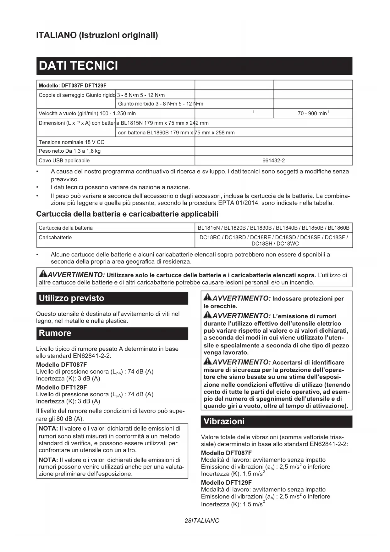 - Alcune cartucce delle batterie e alcuni caricabatterie elencati sopra potrebbero non essere disponibili a secondadellapropriaareageogracadiresidenza. AVVERTIMENTO: Utilizzare solo le cartucce delle batterie e i caricabatterie elencati sopra. L’utilizzo di altre cartucce delle batterie e di altri caricabatterie potrebbe causare lesioni personali e/o un incendio. Utilizzo previsto Questoutensileèdestinatoall’avvitamentodivitinel legno, nel metallo e nella plastica. Rumore Livello tipico di rumore pesato A determinato in base allo standard EN62841-2-2: Modello DFT087F Livello di pressione sonora (L